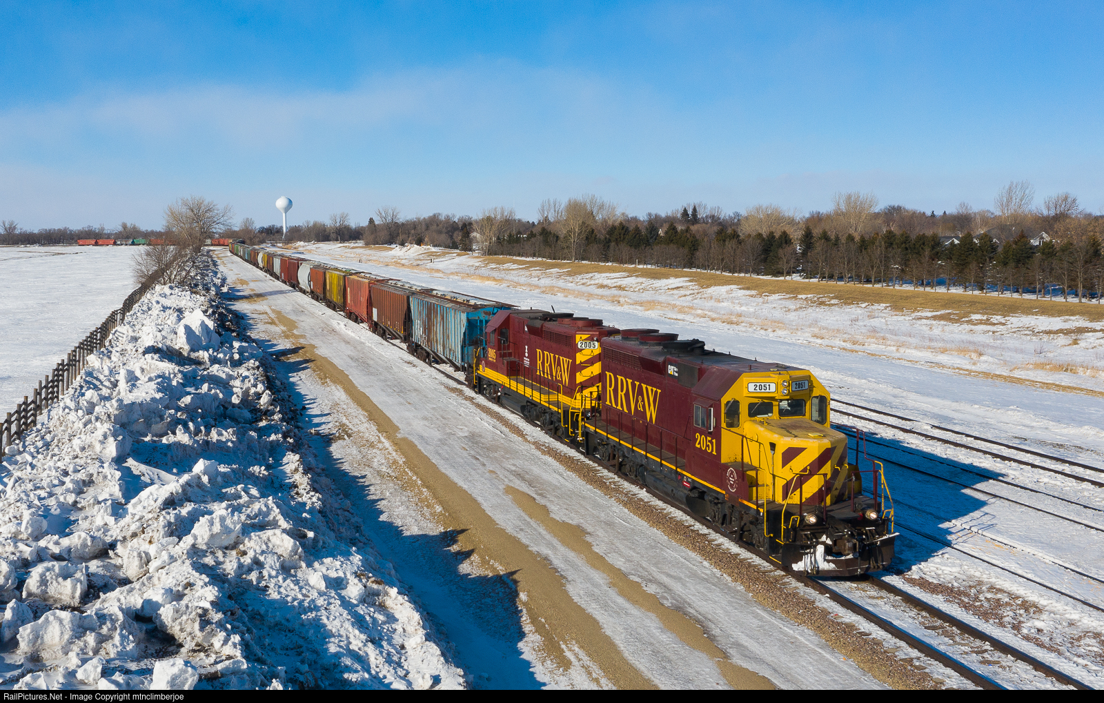 | After completing work at the Maple River Grain Elevator, a pair of Red River Valley and Western GP20C's shove a long cut of hoppers north towards the BNSF interchange in Casselton, North Dakota. Built as GP20's for the Great Northern in 1960, these units are now repowered with Cat primer movers. |
