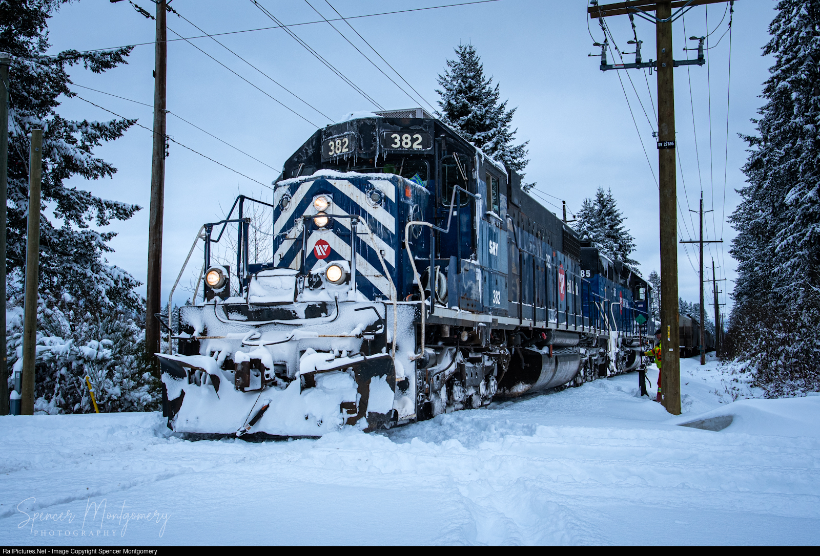 SRY 382 lifts the siding at Sperling in the snow.
