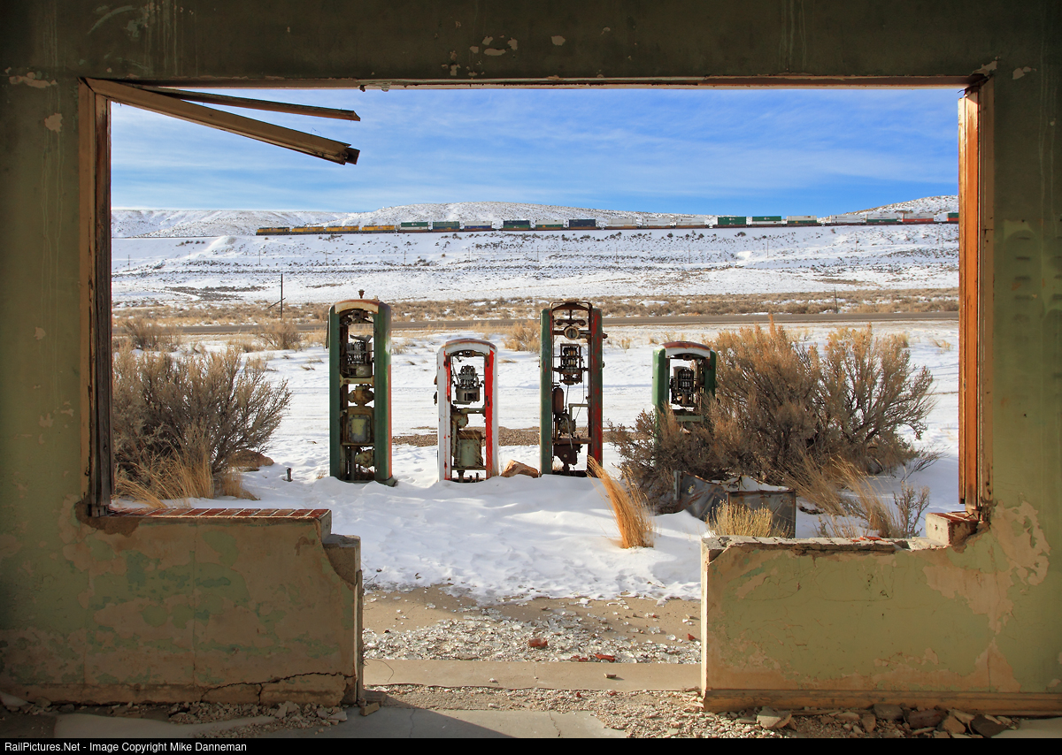 A view from inside a long-abandoned gas station located along the old Lincoln Highway at James Town, west of Green River, Wyoming, reveals an eastbound Union Pacific stack train descending Peru Hill in the background on January 20, 2013. The old building is still there, but the skeletal remains of the vintage gas pumps out front unfortunately disappeared in early 2016, and the inside of the structure is now plastered with graffiti.