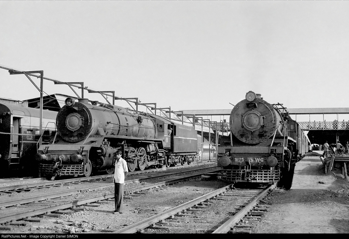 WG #9175 is awaiting departure with a passenger train whilst WG #8018 is running light through the Agra Cantt station.