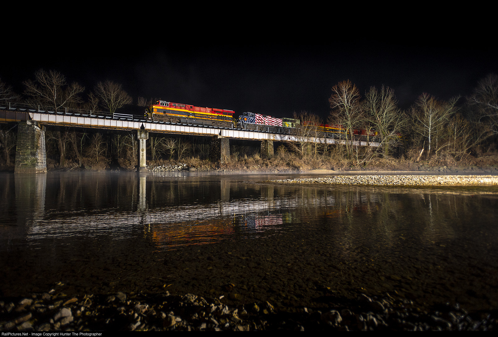 A little over an hour after sunset, northbound manifest train MSHKC-17 rolls across the bridge over the Elk River in Ginger Blue, MO on a clear and cool Wednesday, January 18, 2023 evening. Just a couple of hours earlier, the KCS business train cruised through here, but I was stuck at work and missed the opportunity to catch it. I already had all the equipment in the car with me though, so I decided to go out and try to shoot something anyway. Luck was on my side as KCS 4006 - the veterans unit - was second in the consist and lit up nicely with the strobes.