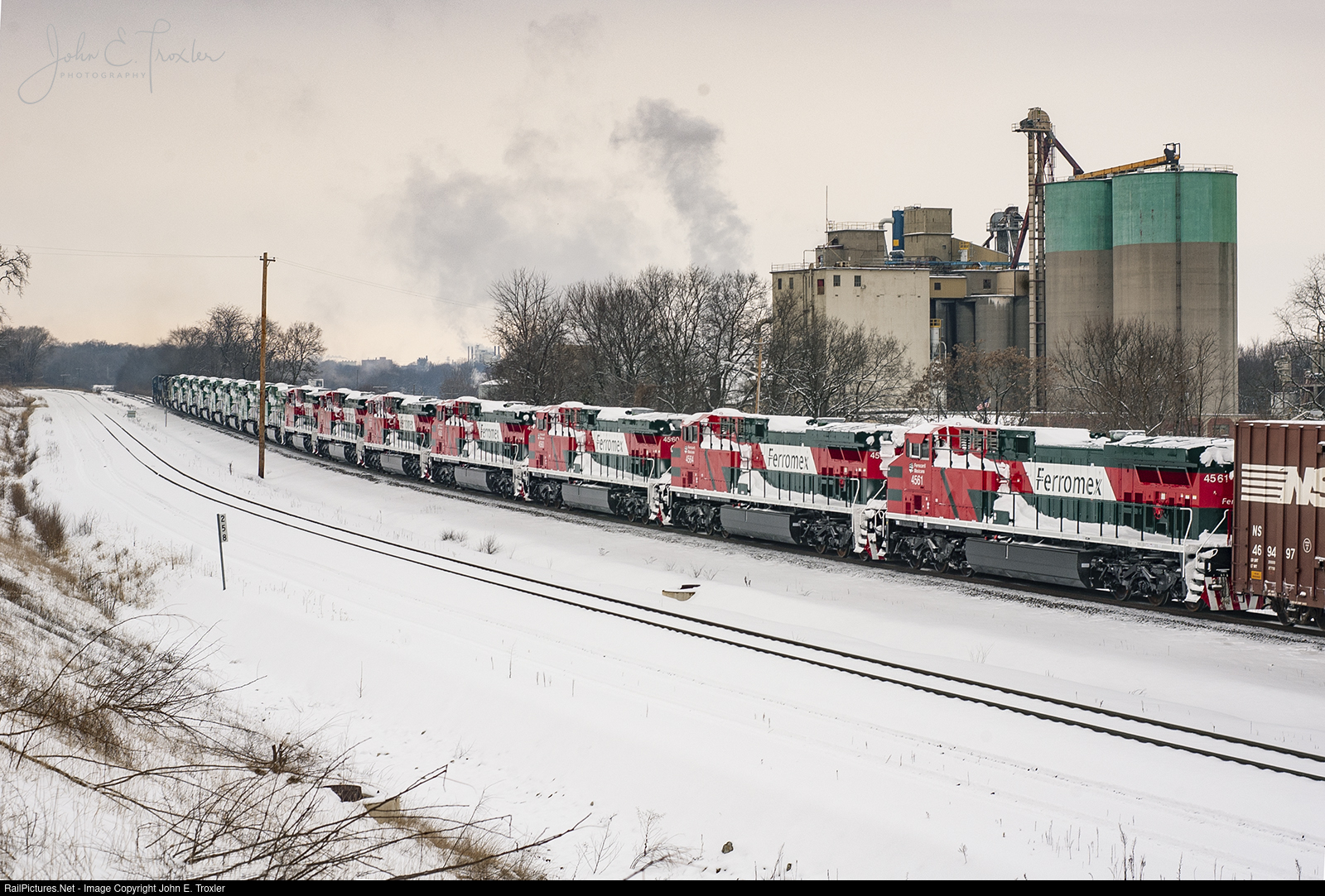 NS 145 leads a westbound train that includes 14 brand new units from GE's Erie, PA plant. The new units were 7 for Ferro Sur and 7 for Ferromex. The location is Lafayette Junction, Lafayette, IN. This area is currently overgrown by vegetation, I am glad I took photos of the area shortly after the NS/CSX rail relocation project was completed.