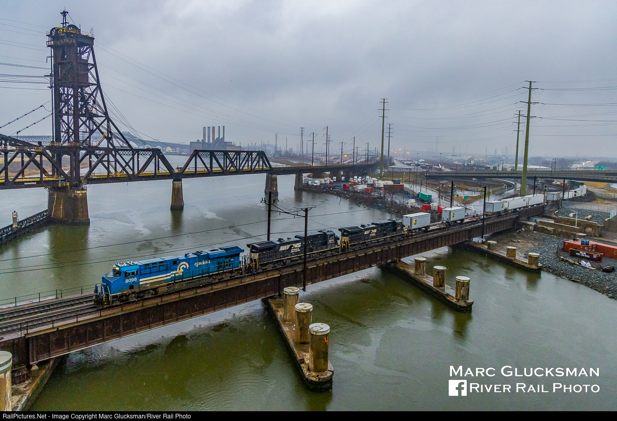 Sneaking Home In The Rain. Norfolk Southern 8098 (ES44AC, GE, 2/2012) is easily the most natural looking of the NS heritage units as only slight modification was required from the design for the C40-8Ws that were some of the last locomotive to arrive on the roster when it was "the big railroad”. While today’s Conrail Shared Assets Operations (CSAO or reporting marks CRCX) exists in 3 metropolitan regions, none of its engines are painted "big blue” or have the “can opener” logo. On Thursday, January 19, 2023, NS train 28X (63rd Street Yard - Chicago, IL-Croxton, NJ) is seen crossing the Harsimus Branch Lift Bridge from Kearny to Jersey City, New Jersey over the Hackensack River in a downpour with some TOFC (Trailers On Flat Cars) on the head end, emulating a scene on CSAO trackage that would look almost as natural prior to the dissolution of the original railroad by NS and CSX on June 1, 1999 with the exception of the recently relocated (read as torn down and rebuilt) Whitt Penn Bridge that would have obstructed this shot.