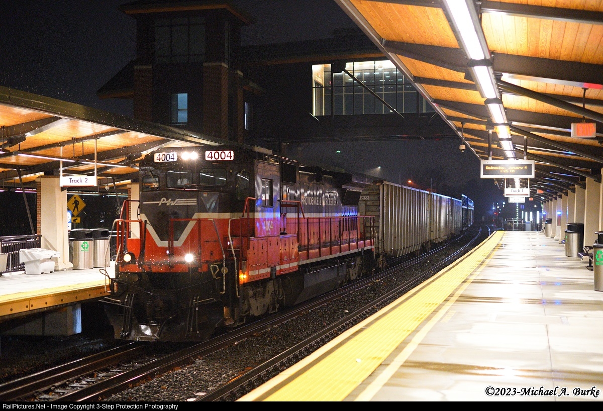 | On a rainy night in Southern New England, Providence & Worcester B40-8 4004 leads Connecticut Southern train CSO-2 past Meriden Station. The crew has finished their work in Wallingford and is heading for CWPM Recycling in Berlin. |