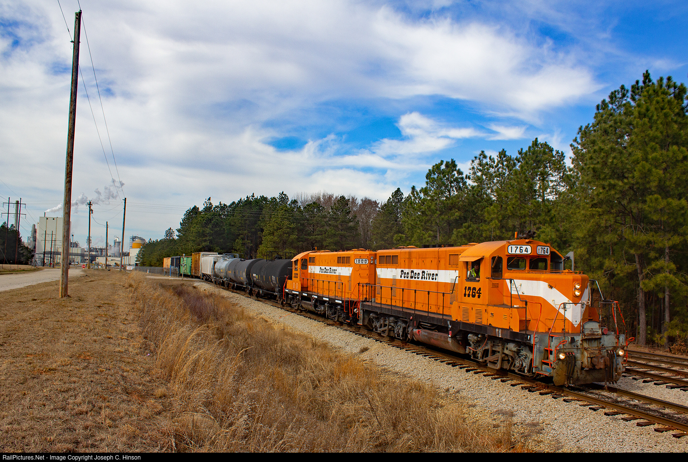 Pee Dee River Railway 1764 leads a train through some final switching moves at the small yard in Marlboro, South Carolina. The yard feeds the Domtar Paper Mill which can be seen in the background.