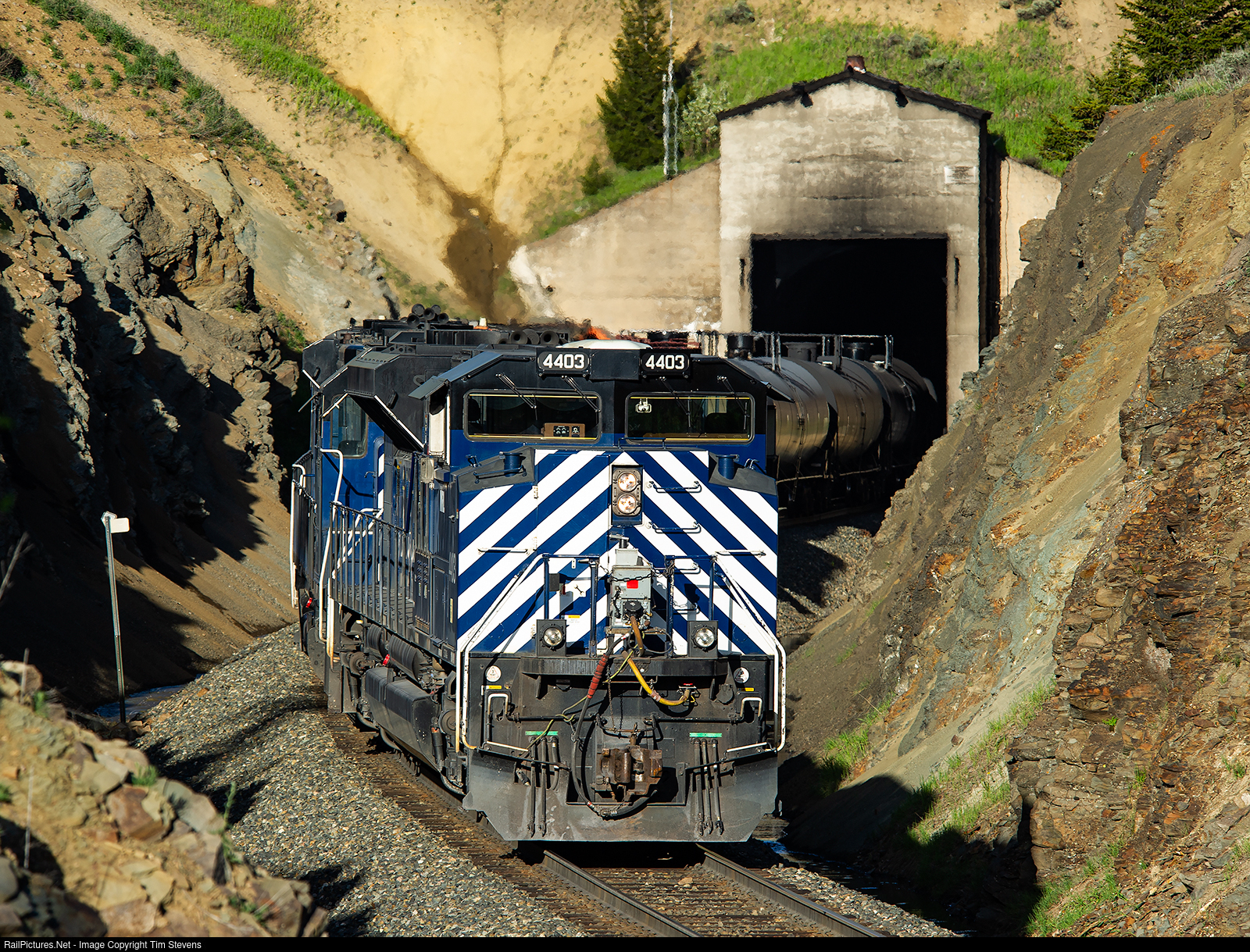 MRL SD70ACe 4403 brings up the rear of a loaded diesel train heading into the west portal of the Bozeman Tunnel.