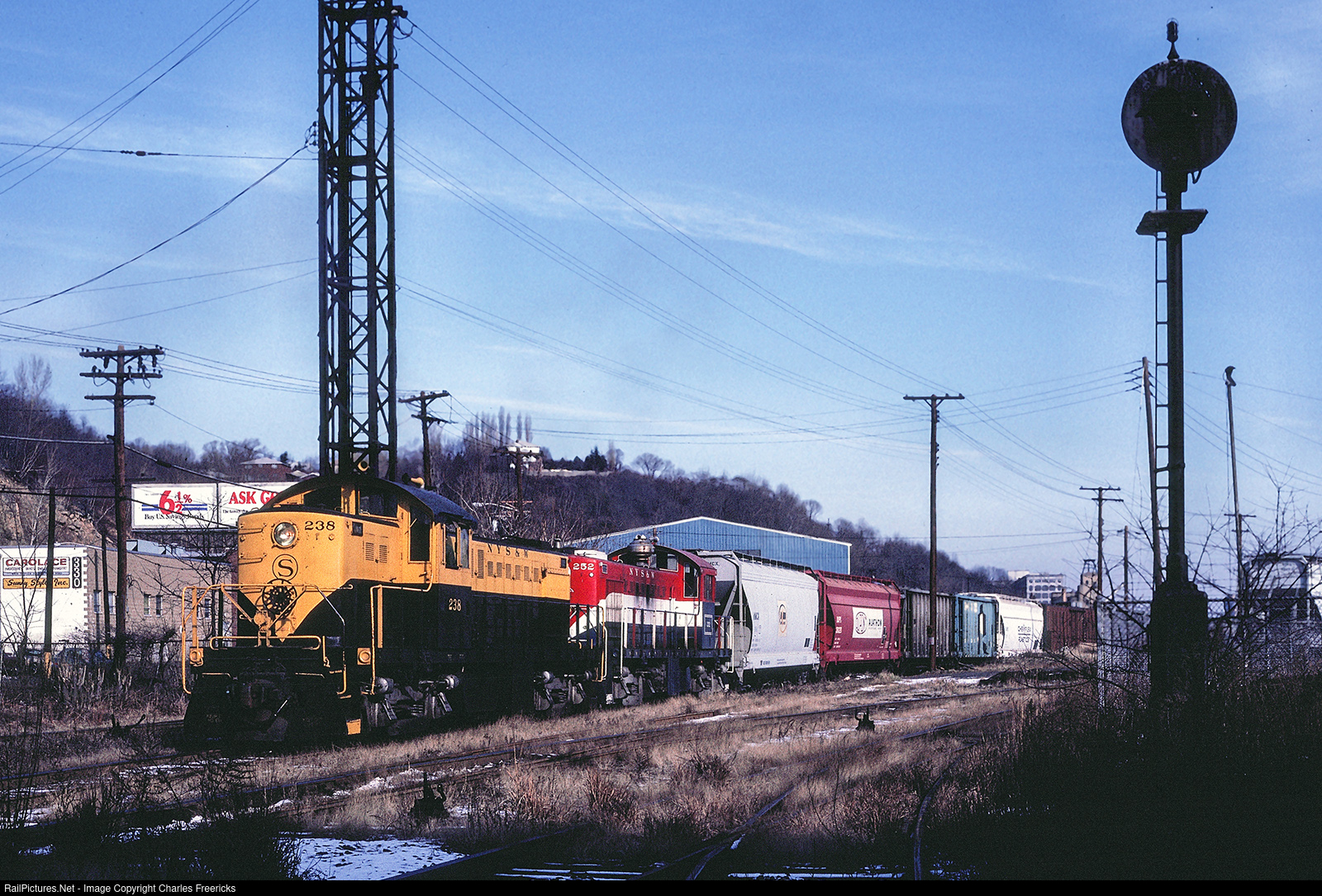 By 1980 the RS1s were pretty much relegated to the Edgewater Branch. Today, both the branch and the RS1s are gone, the track is River Road, and the Ford Plant is River Club Apartments. That blue building however survives as a storage facility (now white and green). RS1 #238 was first delivered from ALCO in April of 1945. #252 was delivered in October of 1947. Both were later scrapped.