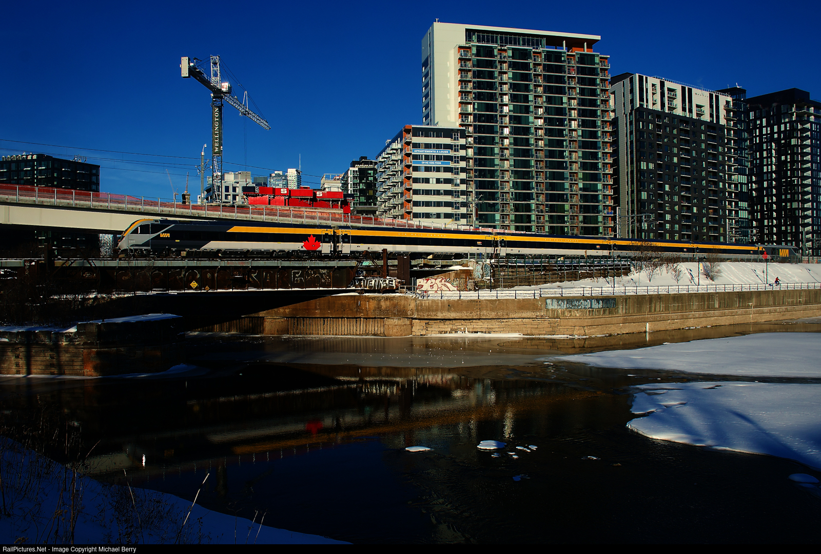VIA 33's Siemens consist is partly reflected in the Peel Basin as it crosses over the Lachine Canal. VIA 33 still has a Siemens consist only once a week on Tuesdays and only out of Montreal.