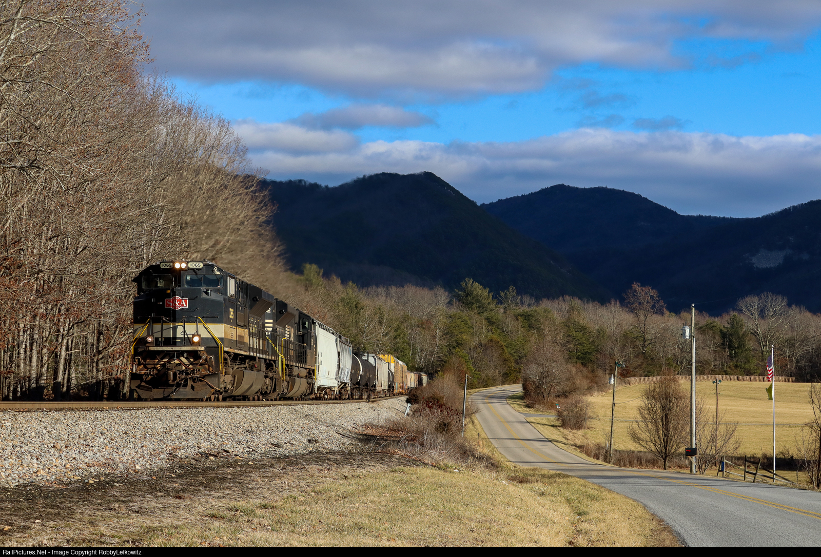 After originally holding for about 2 hours after hitting a tree and having issues with its headlights, ditch lights, and horn, NS 14Z with the Savannah & Atlanta Heritage Unit finally headed north and the train can be seen here climbing the uphill grade of Lofton Mountain in Raphine, VA