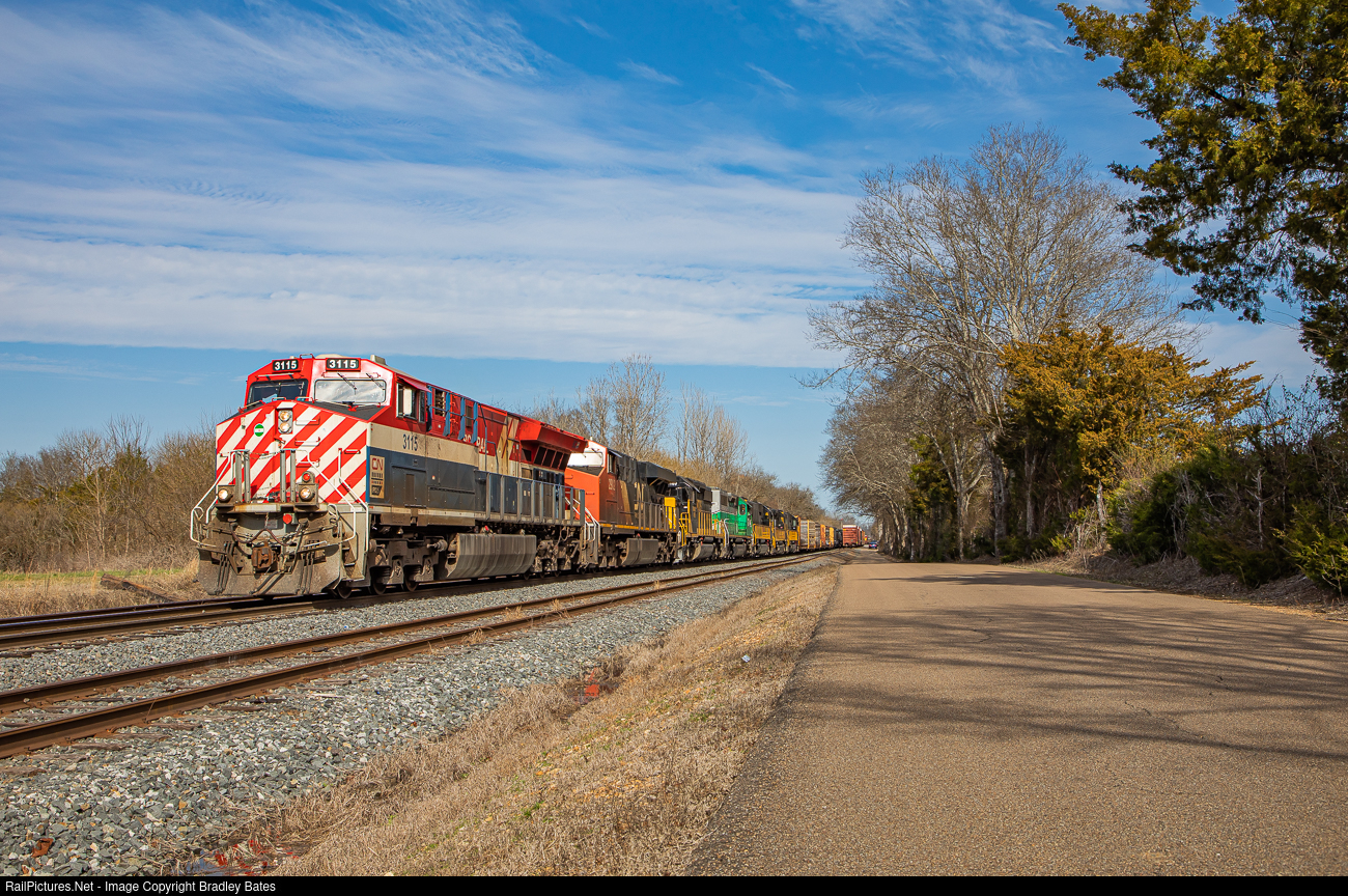 Canadian National's BC Rail Heritage ES44AC locomotive #3115, leads Alabama Southern Train 112 as they interchange with KCS at Artesia, MS., before returning back east to Tuscaloosa, AL.