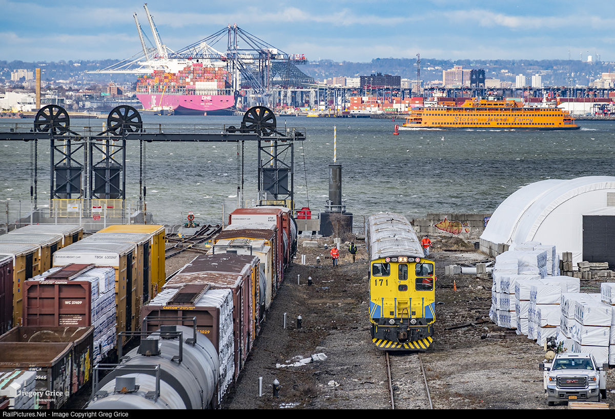 LIRR MP15AC 171 spots the six M7 railcars at the far end of NYNJ's 65th Street Yard as a Staten Island Ferry passes in the background.