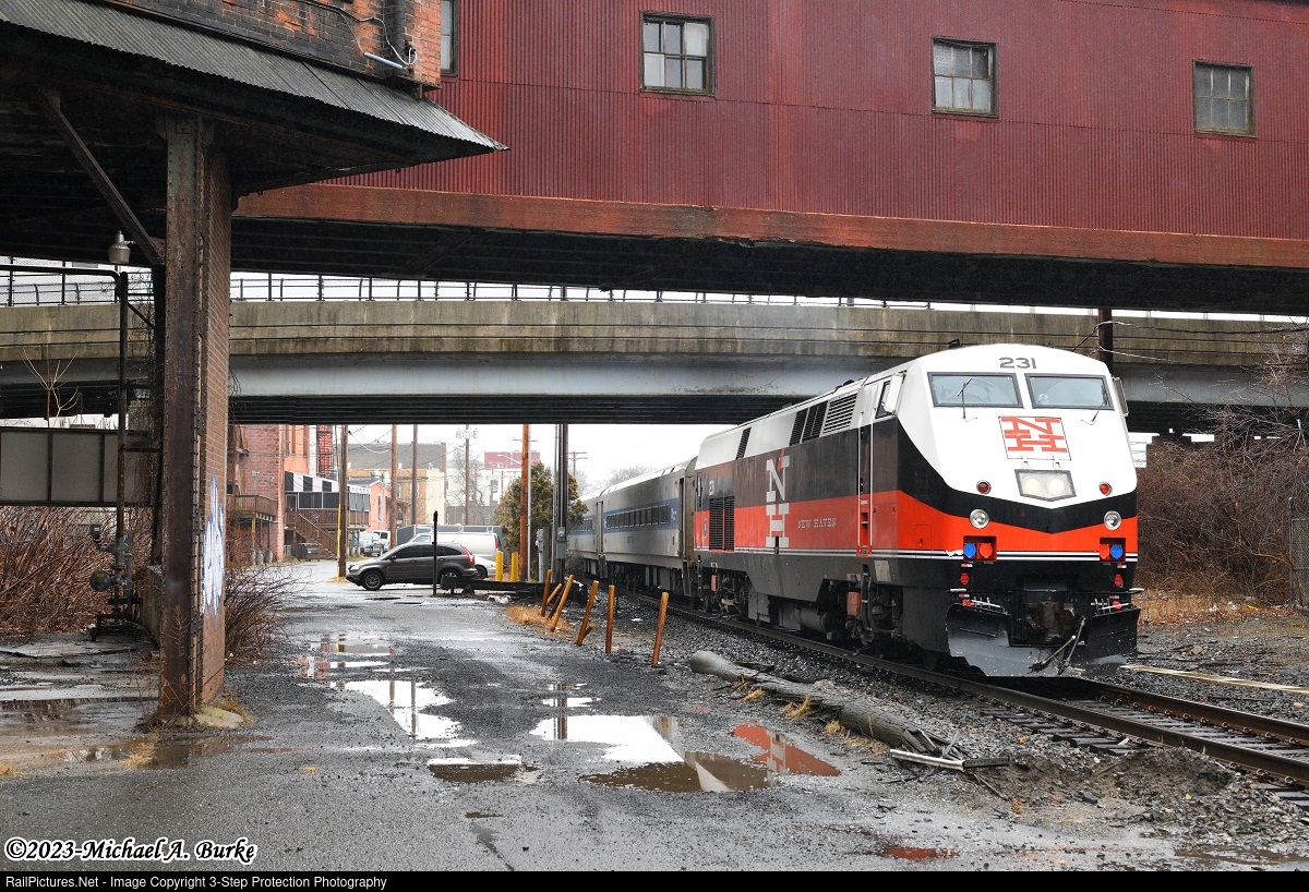 | On a grey Monday morning in Ansonia, New Haven P32 231 leads Metro-North train 1916 towards Waterbury. While parts of Connecticut saw snow, it remained rain in the Naugatuck Valley. The inspired New Haven McGinnis colors are right at home on former New Haven Rails, which also served the Ansonia Farrels Factory that the train is passing by. |