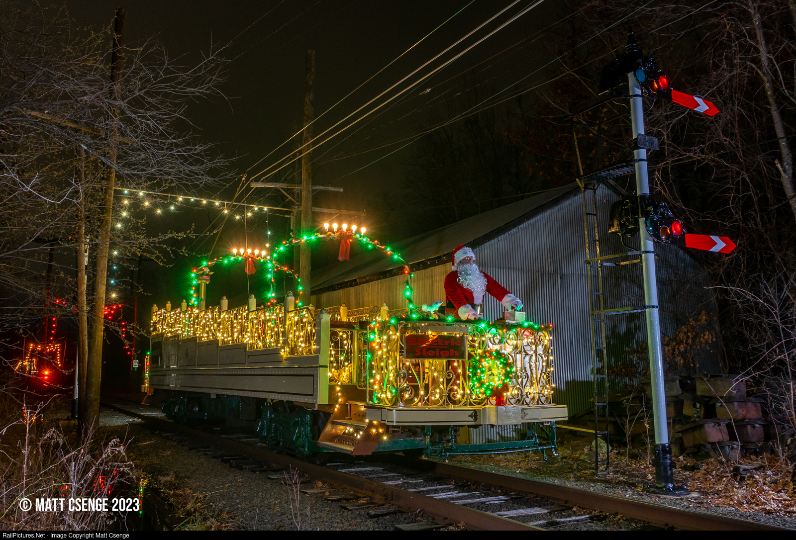 Montreal Tramways open observation car no. 4 (MT Youville Shops, 1924) is seen on the Connecticut Trolley Museum's main track next to their freshly repainted - and operable - semaphore signals. The trolley is decked with lights for the museum's Winterfest and the Tunnel of Lights event, and a sign on the front referring to it as Santa's "Electric Sleigh!" |
