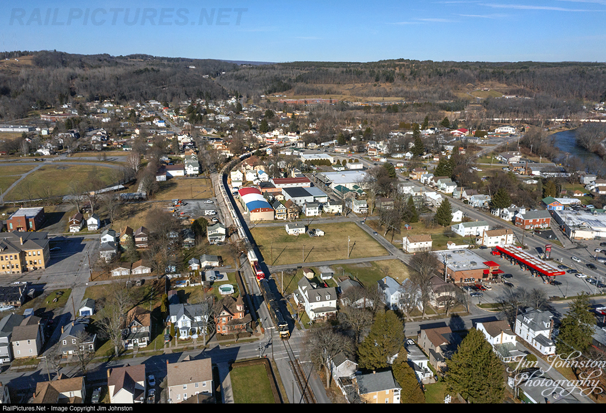 RJ Corman RJC 1 with NS 4268 in the lead is street running in Clearfield with an empty grain train destined for Cresson, PA. The rear of the train can be seen crossing the West Branch of the Susquehanna River on a beautiful Winter day..