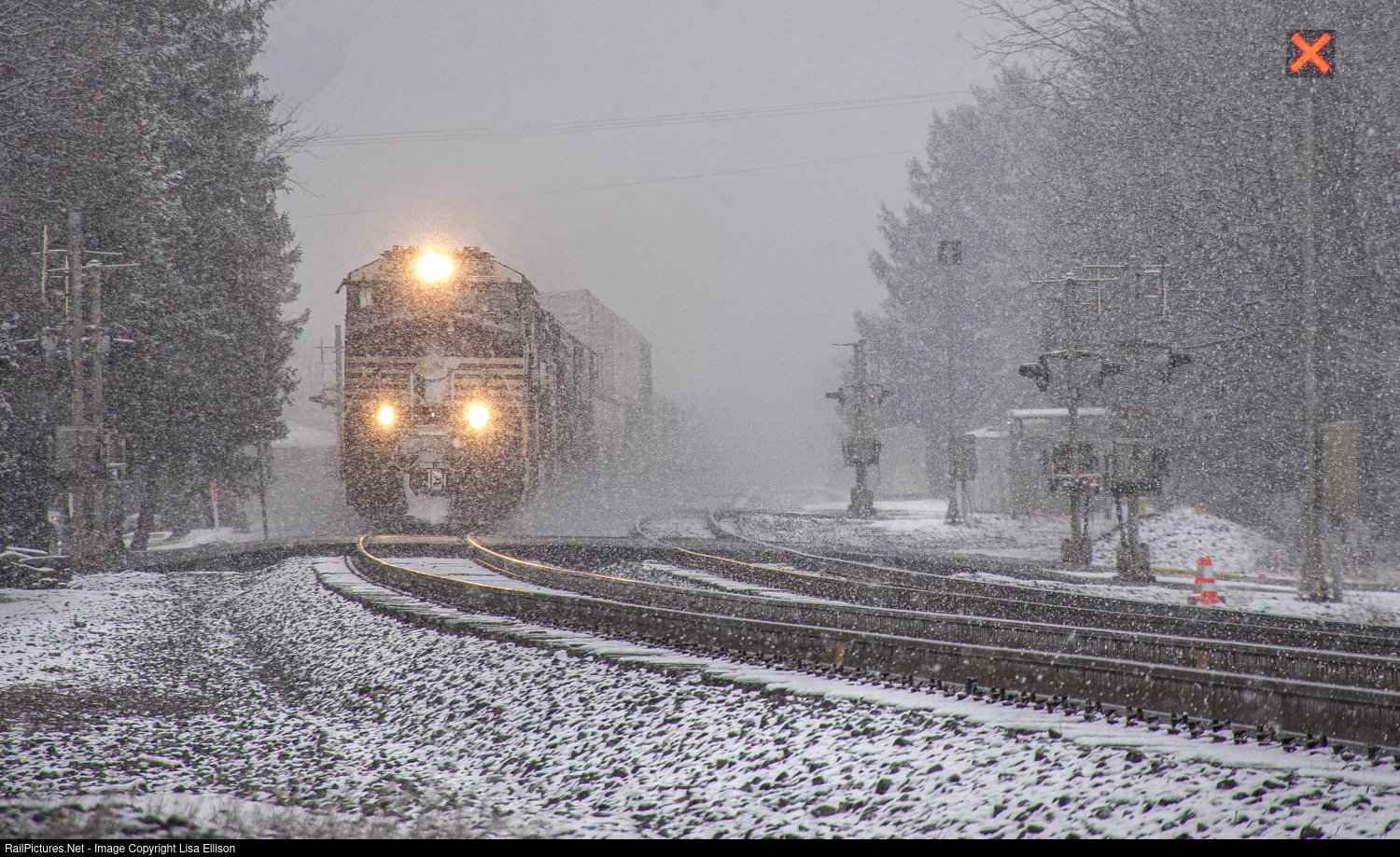 During a winter snow squall, the NS 23G rolls through the Main Street crossing in Vermilion, Ohio. About the only thing you can clearly see in this picture, is the red X-Box flashing, indicating the quiet zone is in proper order.