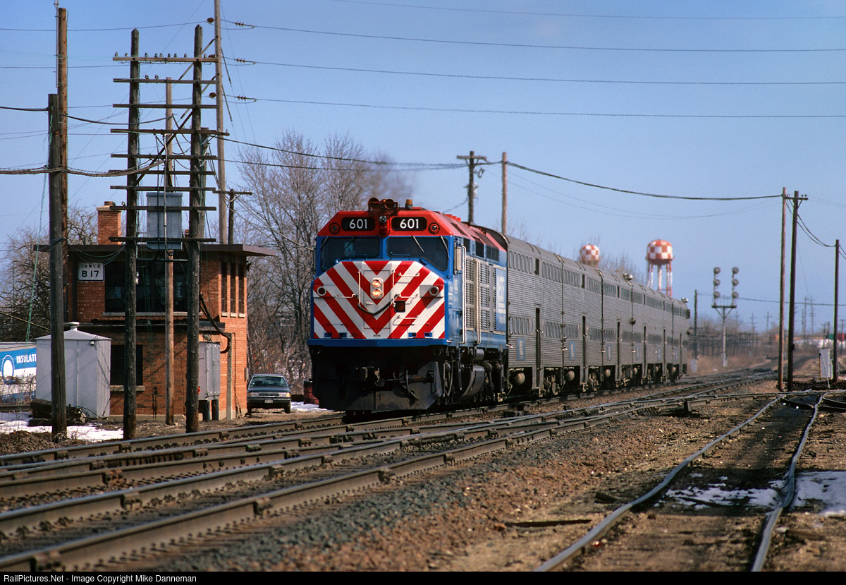Metra EMD F40C No. 601 leads a westbound commuter train past Tower B17 at Bensenville, Illinois, on March 3, 1990. Similar looking to Amtrak’s SDP40F, the F40C has unique corrugated side panels and is built on a standard SD40-2 platform. Bought for commuter service on Milwaukee Road lines out of Chicago, a total 15 3,200 hp F40Cs were built by EMD. The first 13 units were bought by and lettered for North West Suburban Mass Transit District, while the remaining two were lettered for North Suburban Mass Transit District. All 15 spent all their lives working the lines west to Elgin and Fox Lake, eventually working under the Chicagoland commuter authority Metra.