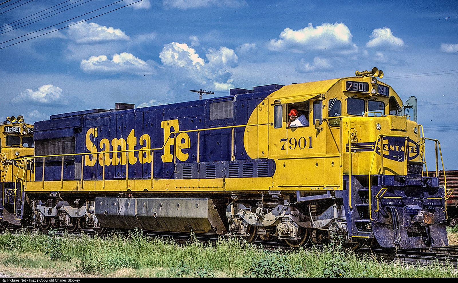 OKLAHOMA CITY OK Sept 3 1978 — Santa Fe U28CG 7901 makes a reverse move with its train. U28CGs were delivered in Red and silver warbonnet for passenger service. With the creation of Amtrak they were assigned to freight service, had their steam generators removed and were painted in freight colors. My photo.