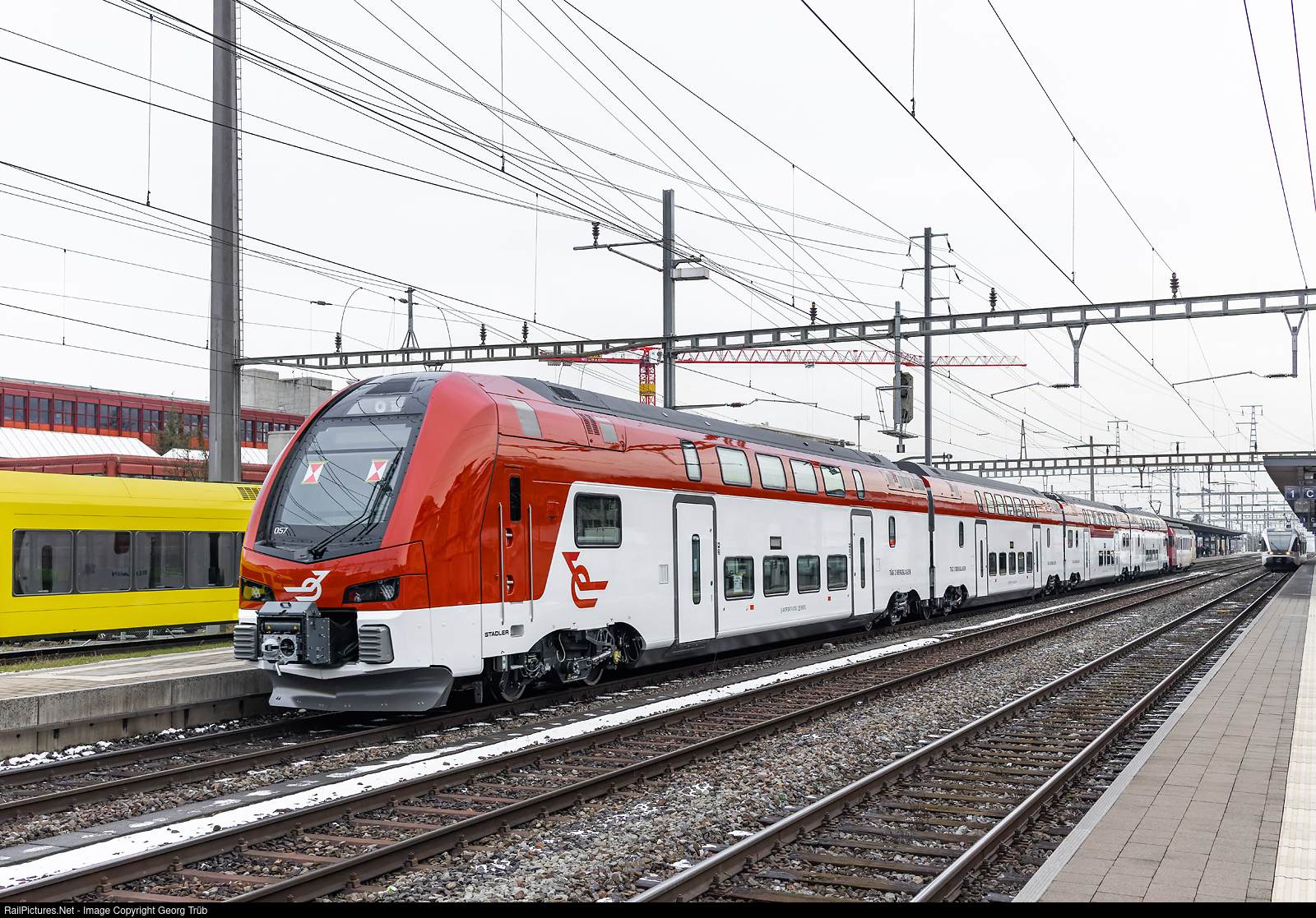 | Transfer run of the new doubledeck train ER1 # 057 from StadlerRail for the swedish Tåg i Bergslagen, pulled by railcar RBDe 567 # 172 of the TPF, rented by StadlerRail. The train circulated from Erlen via Winterthur-Kloten-Regensdorf-Bözberg to Basel SBB RB, running through Weinfelden. |