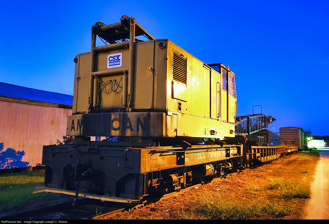 Seaboard Coast Line (SCL) 765454, a railroad crane, rests in Mullins, South Carolina attached to several cupport cars. At the time, I thought CSX was positioning it there for the next inevitable Carolina Southern derailment. The interchange between the two railroads was about a mile away from here.