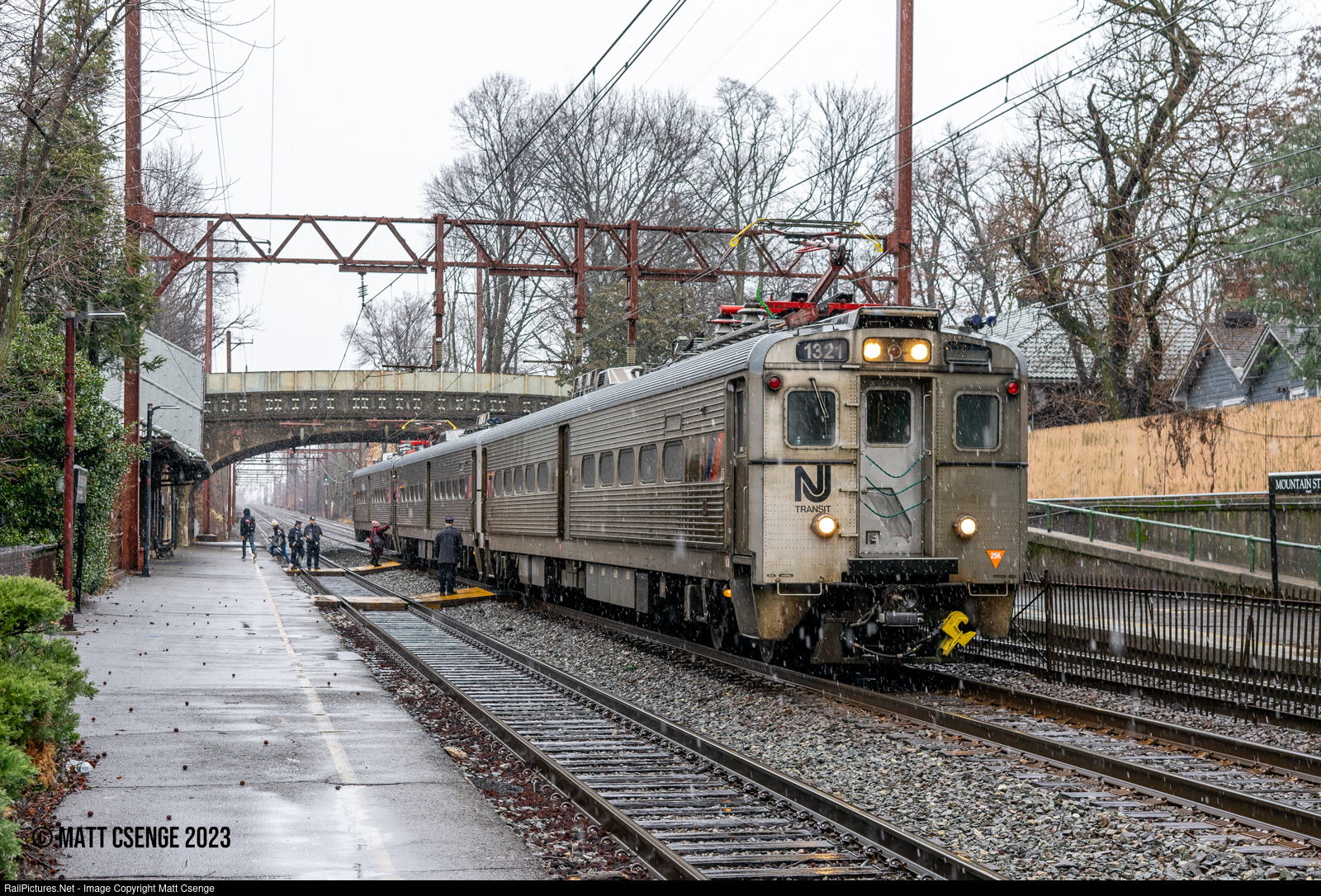 NJ Transit Gladstone Branch train no. 419 is seen stopped at Mountain Station, with Arrow III car no. 1321 (GE, 1977-1978) leading. Due to track maintenance work on Track 3 near Orange Station, westbound trains were stopping on the center track and discharging passengers across the local track. This coupled with the snow flurries made for a great scene to photograph! |