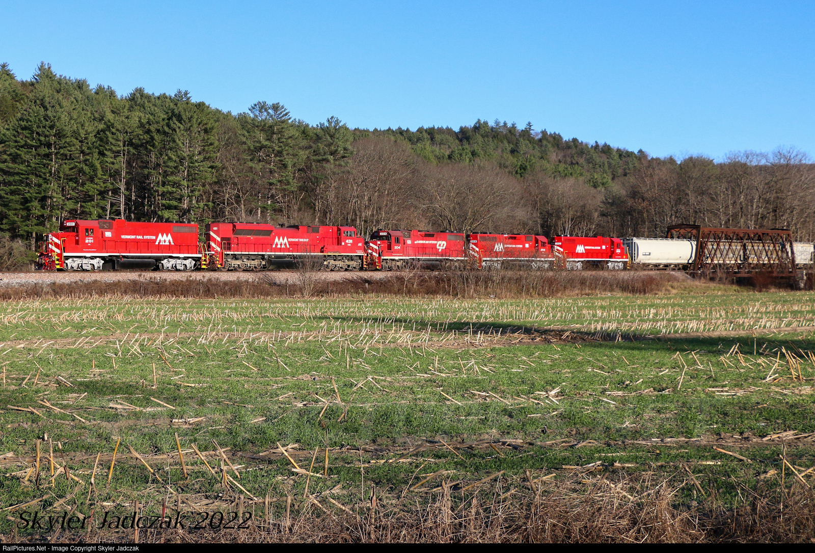 GMRC 264 heads north through Rockingham VT with a great lashup of five red units.