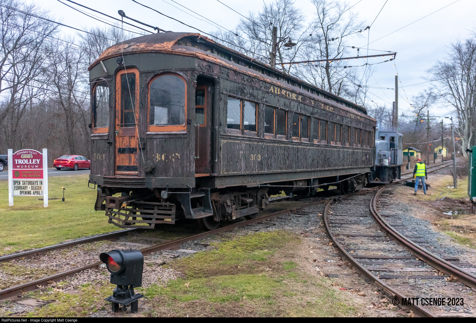 Chicago, Aurora & Elgin no. 303 (Niles Car & Manufacturing Co., 1906) is seen being pulled around by Hartford Electric Light Co. no. 1 (GE, 1949) at the Connecticut Trolley Museum. 303 is operable, and extensive restoration work has been done inside the car, but it was being moved to a non-electrified part of the museum so that exterior restoration could begin.