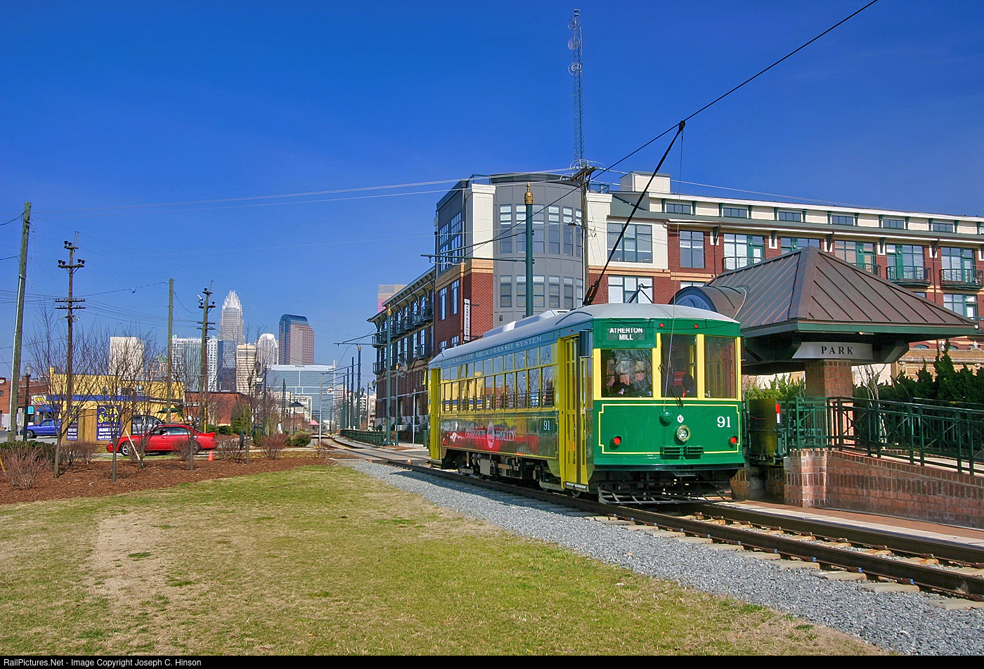 Before Charlotte built their light rail line from Pineville to downtown, they ran trolley cars on a short section of former Southern Railway single track line. This shot taken in February 2005 shots CATS 91 heading for the skyscrapers. zthe four trolley cars owned by Charlotte were replicas built a year prior to this photograph. They were still used some after the light rail opened up including handling the traffic on the street car line for a time. In the past few years, they were sold to Memphis Transportation Authortity.