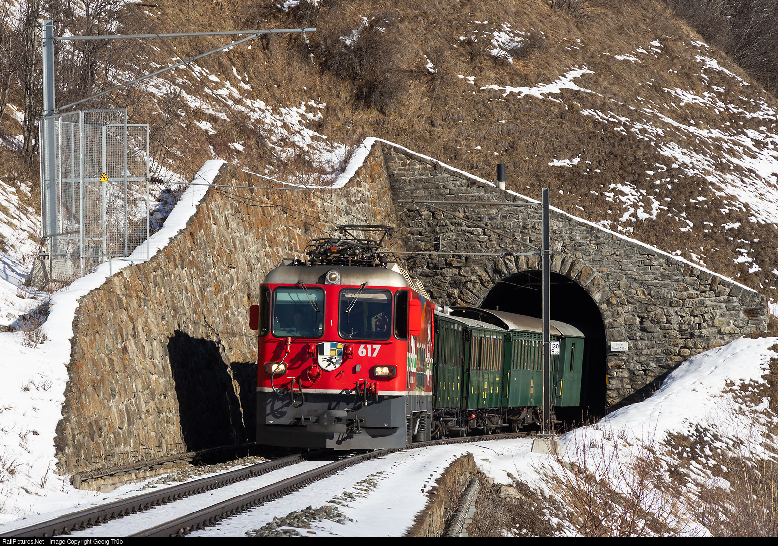 For filming in historic railroad cars of the Rhaetian Railway, this train 9933 ran from Scuol-Tarasp to Zernez with loco Ge 4/4 II # 617 in the publicity paint scheme for "50 years LGB", leaving the Gonda tunnel between Guarda and Lavin. Since only interior shots were on the program, no matching historic locomotive needed to be used. The cars were baggage D # 4052 (built 1913), first class A # 1102 (1903), third class C # 66 (1897) and third class C # 32 (1889).
