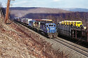 On April 17, 1979, my friend Paul Wester and his dad Pete Wester took me on a roadtrip to Horseshoe Curve. Back in those days, climbing over and around the hills there was far more acceptable. Here's one of our catches... TV61 with an SD35 leader, a GP35 sandwich meat, and a brand new GP40-2 trailer. SD35s were nothing that impressive back in those days. Can't remember the last time I saw one.