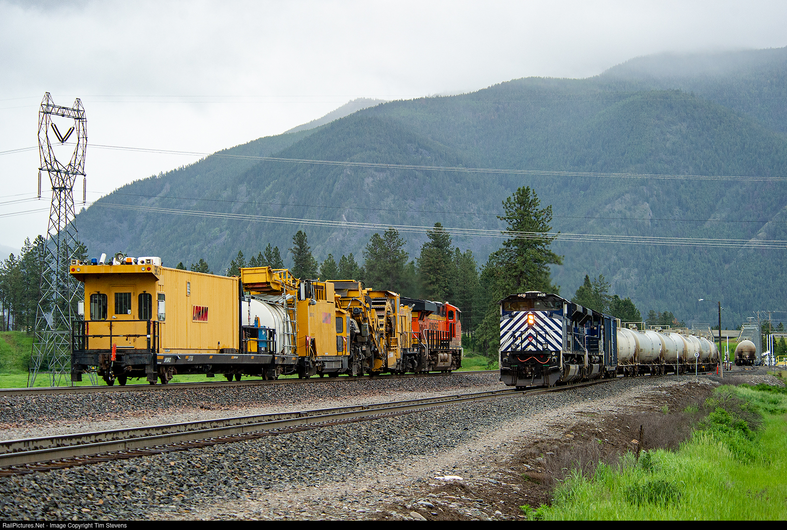 MRL's "Night Gas" local puts its train away at Pipeline while a short BNSF U TPPDEN5 11 (Tacoma-Denver) undercutter move flies by on the main.