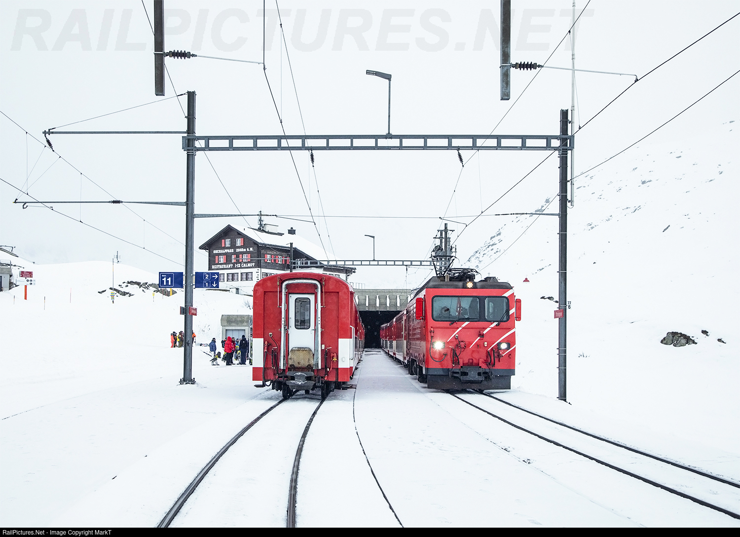 Two trains pass at the snowy Oberalpass, a mere 2000 metres above sea level.