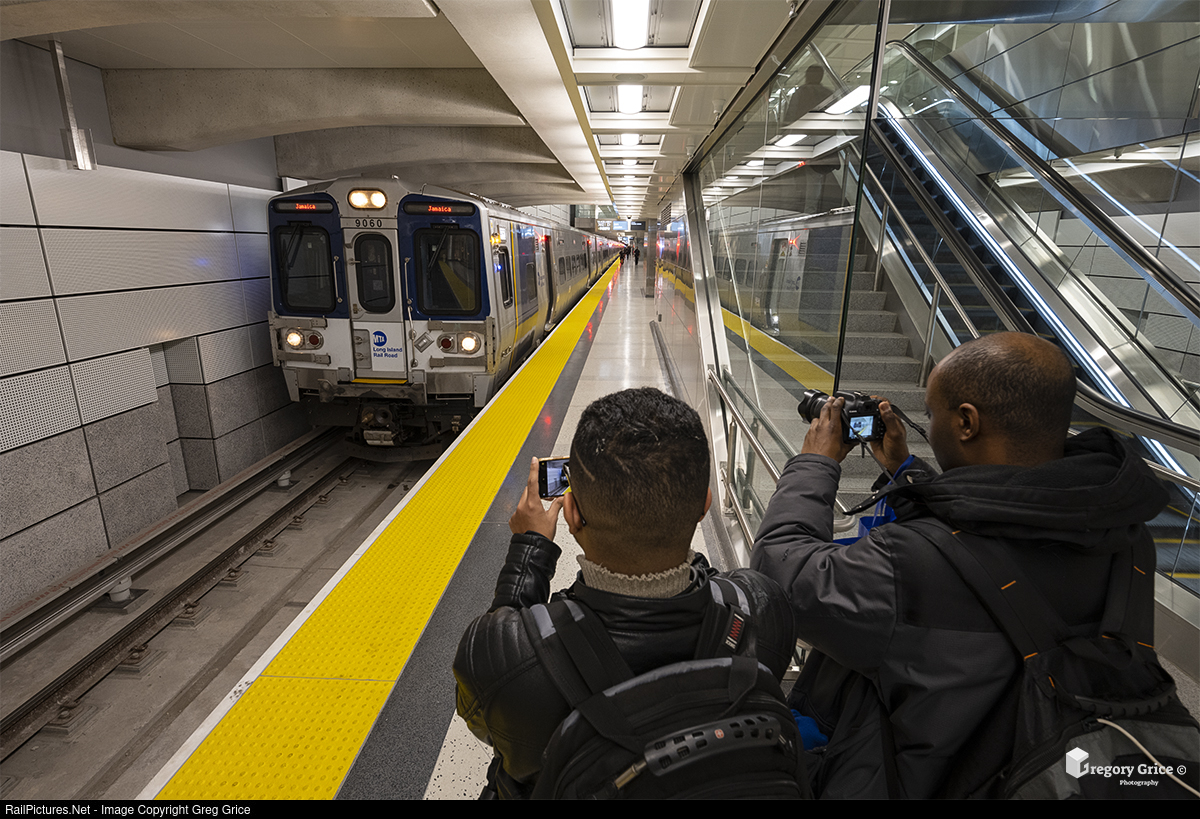 On the morning of January 25th, 2023 the Long Isalnd Rail Road finally opened Grand Central Madison to the public. The morning of the debut featured a special 12-car train which carried New York's Governor, dignitaries and the terminal's first revenue passengers. For the rest of the day, "GCM Direct" shuttle trains ran back and forth between the new terminal and Jamaica. The announcement of the opening came just 2 days prior which meant most railfans were unable to takeoff to ride the first train. Here we see a couple of buffs videoing the last shuttle of opening day, led by Kawasaki M9 railcar #9060, as it prepares to depart the terminal at 8:04PM.