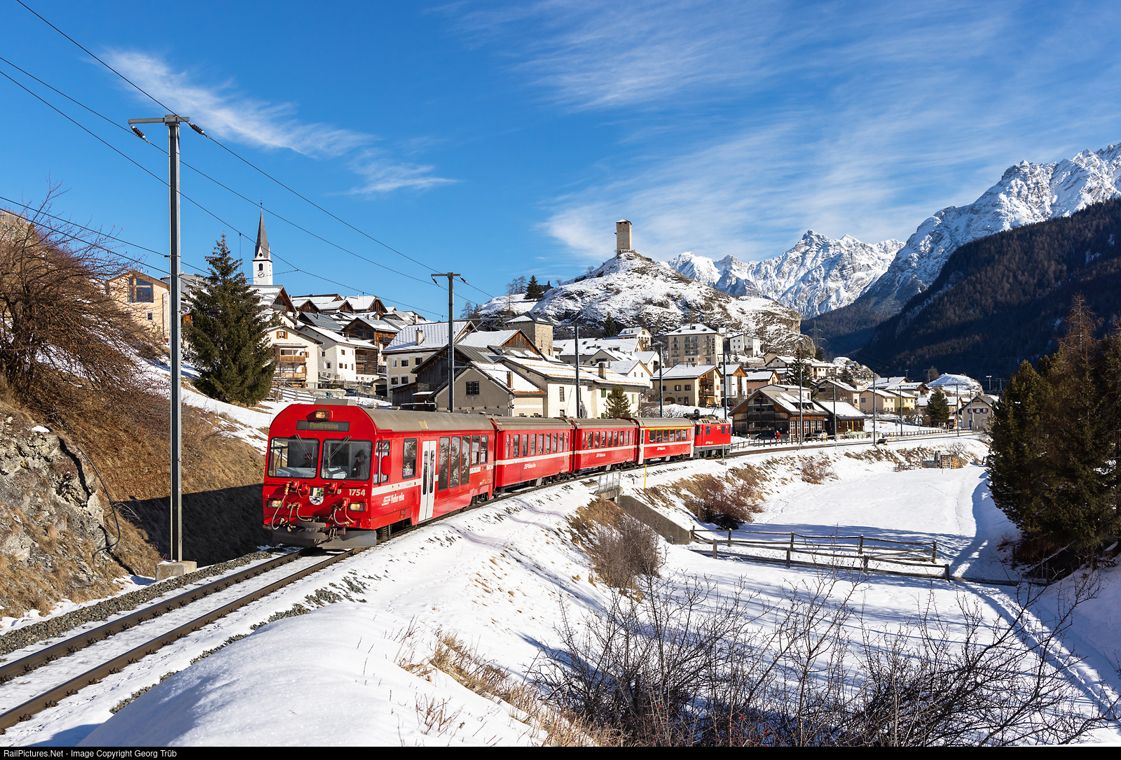 | Regional train 1941 of the Rhaetian Railway from Scuol-Tarasp via Samedan to Pontresina is leaving Ardez. Leading is cab car "Neva Retica" BDt # 1754 and shoving in the rear locomotive Ge 4/4 II # 624. |