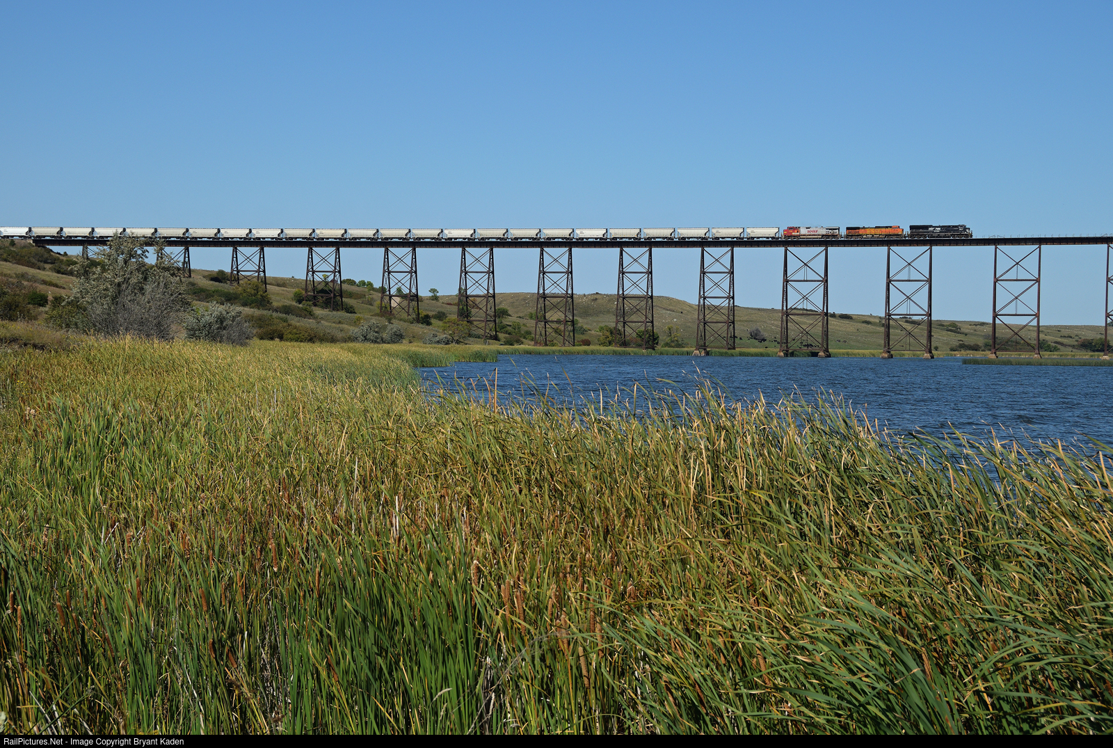 An eastbound empty sand train crosses Lake Ashtabula near Luverne, ND behind a rainbow consist of NS and BNSF power.