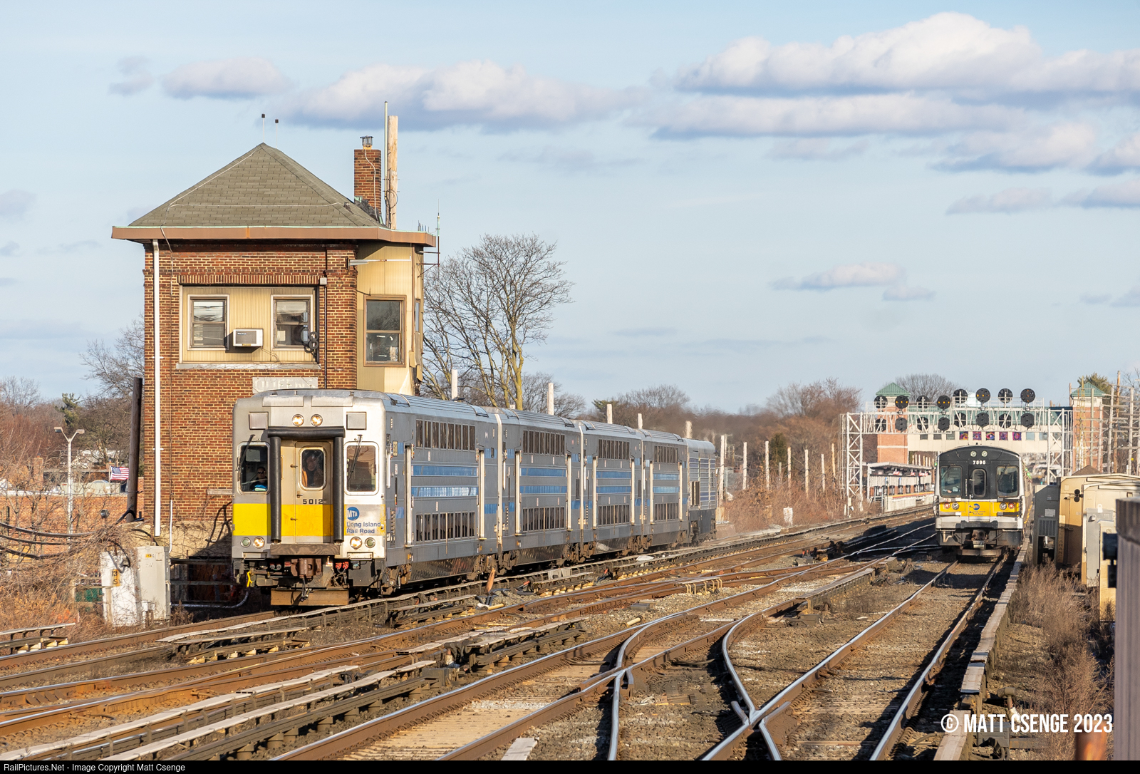Long Island Rail Road (LIRR) C3 cab car no. 5012 (Kawasaki, 1997-1999) is seen leading Oyster Bay Branch train 553 to Jamaica as it passes QUEENS Tower east of Queens Village Station. |