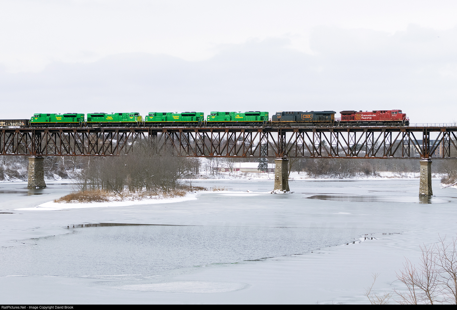 Before getting to New Brunswick, CP decided to give NBCR's new power a little tour of Southern Ontario. 132 took them from Chicago to Welland, 237 took them from Welland to Hamilton, 239 then took them west from Hamilton to Ayr (Wolverton), and 48 hours later they pass Galt and headed in the right direction again. Who knows where they'll end up next. Crossing the Grand River in Galt, Ontario.