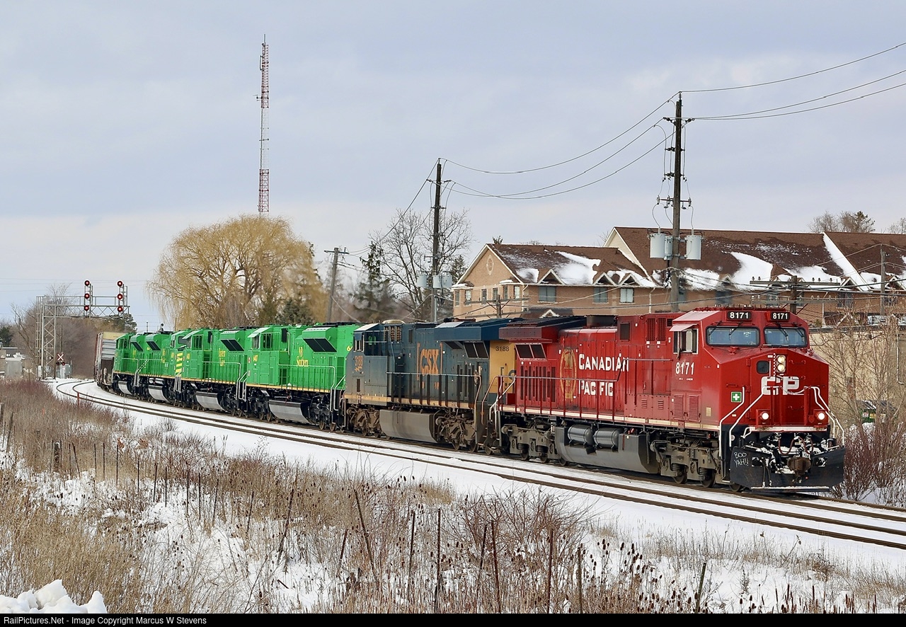 | After taking the scenic route from Buffalo four New Brunswick Southern SD70M-2’s (ex NS) train on CP 230 trailing with a CSX GEVO at Streetsville. The previous day they were dropped at Welland then eventually made it to Wolverton then lifted by 230 and headed to Toronto. |