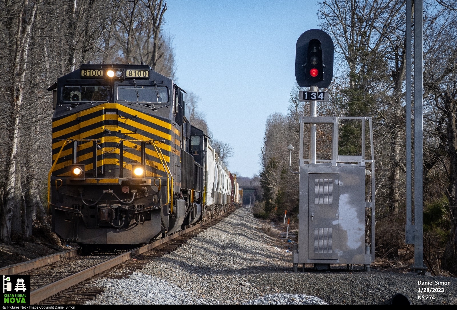 Norfolk Southern train 274 clears the B-13.3 signal heading west on the NS B-Line featuring NS 8100 as the lead engine.