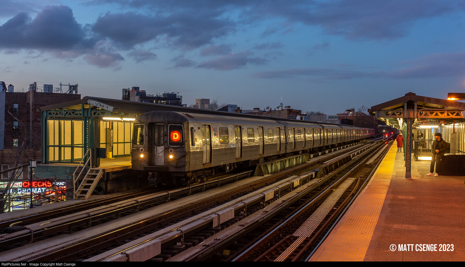 Blue Hour on the BMT. New York City Transit Authority (NYCTA) R68 no. 2508 (Westinghouse-Amrail, 1986-1988) is the lead motor on a Coney Island-bound D train seen stopped at Fort Hamilton Pkwy Station on the West End Line.