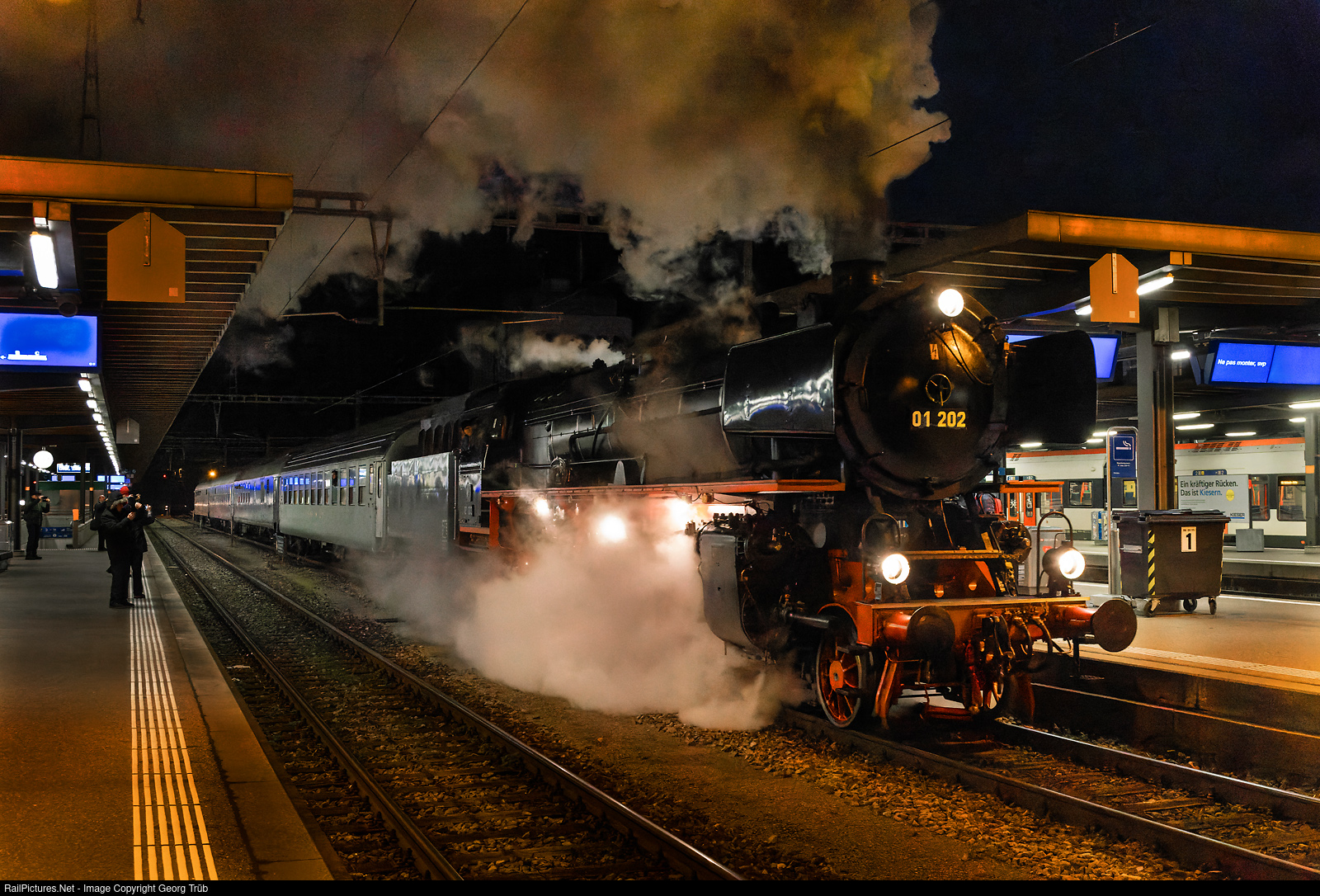 | The former Deutsche Bundesbahn 4-6-2 express train steamlocomotive 01 # 202 of the association "Pacific 01 202" from Lyss is leaving Biel with the winter steam special from Vallorbe to Lyss. |