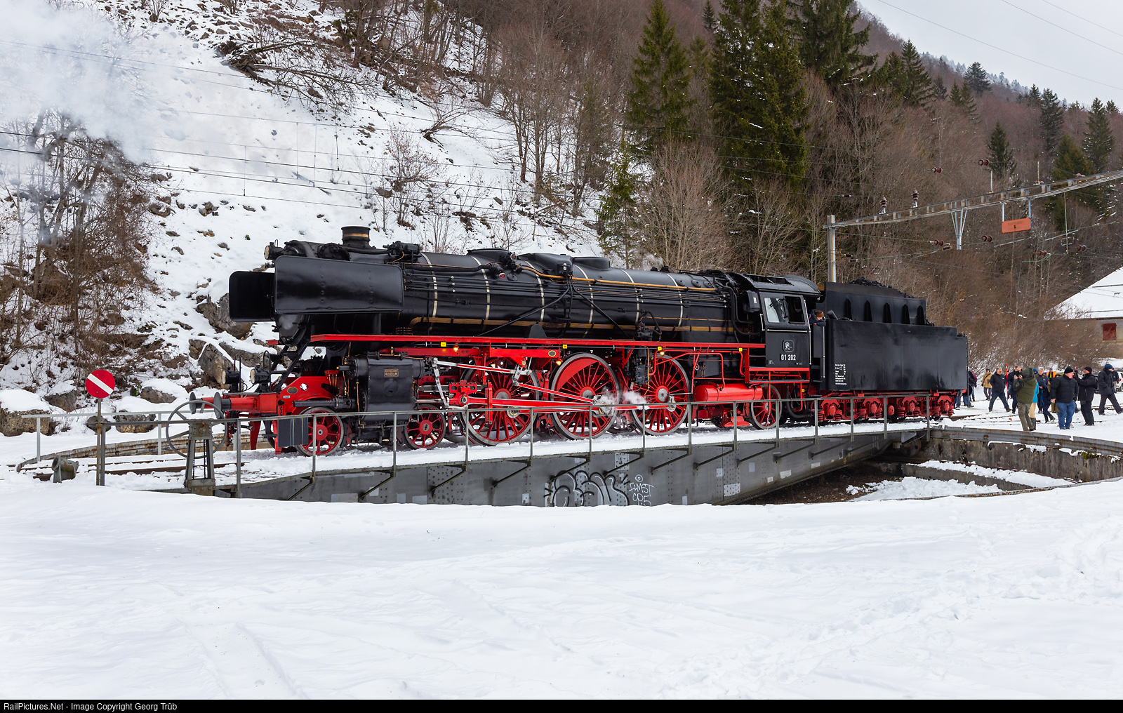 | The former Deutsche Bundesbahn 4-6-2 express train steamlocomotive 01 # 202 of the association "Pacific 01 202" from Lyss is slowly moving onto the 23 meter diameter turntable of Vallorbe, on the occasion of the winter steam train from Lyss via Berne-Lausanne. |