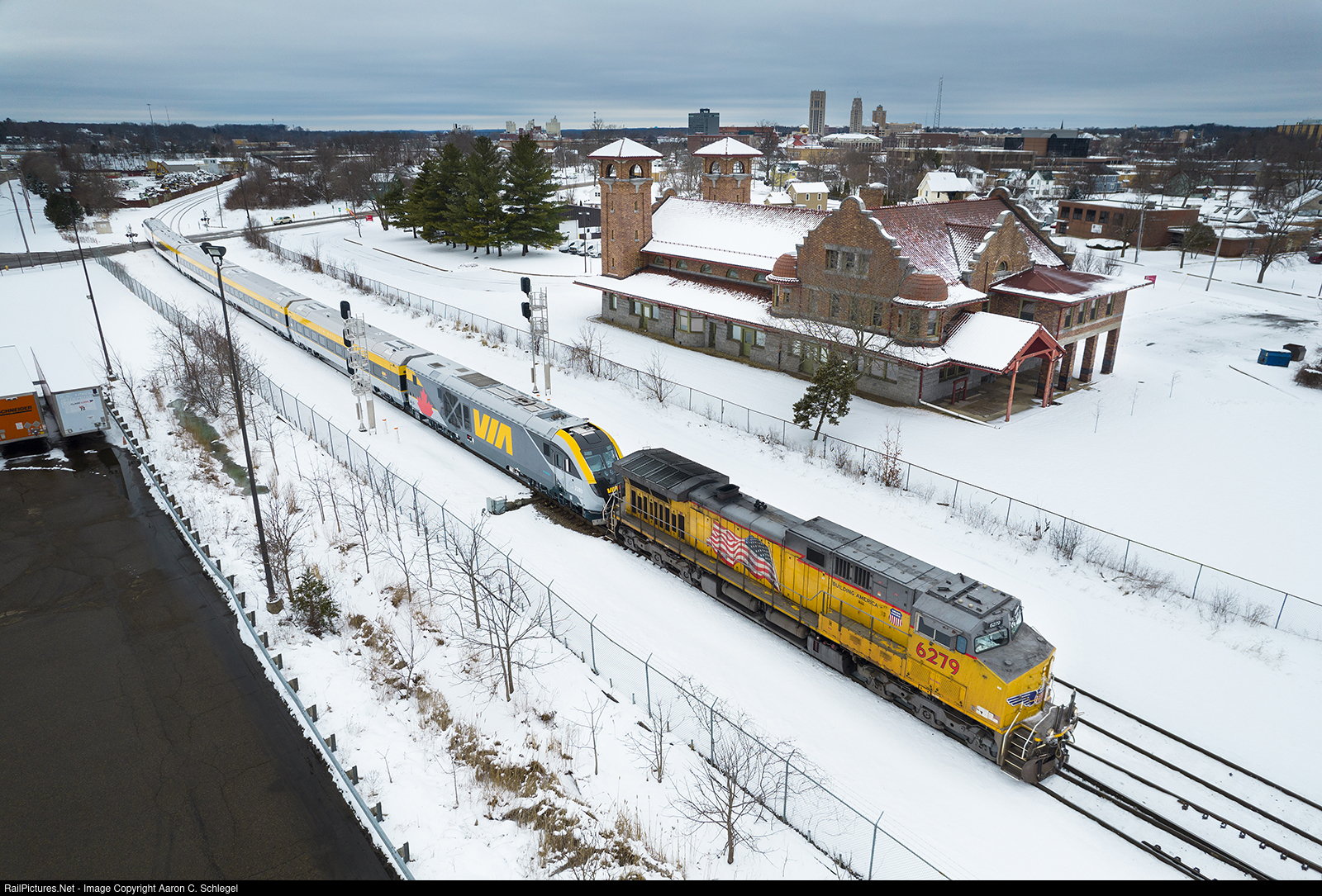 | The X SP 248, Now the UP 6279 leads E276 East through Battle Creek. This 276 was a surprise movement of a New VIA Rail Set for delivery in Montreal. Previous moves have been under P or L symbols. Here E276 has just knocked down BARON and is rolling by the former GTW Passenger Depot in Battle Creek. The Depot, Built in 1906 is now the Battle Creek Community Action Agency. The train is being routed into the West Yard Extension where it will get a Power Swap to continue into Canada. The CN 3061 will lead East from Battle Creek for delivery in Montreal. |