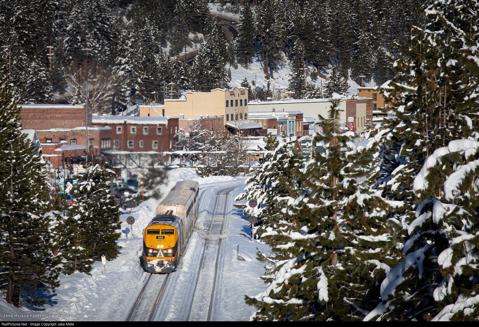 After a five hour delay, Amtrak’s California Zephyr rockets west out of Truckee and heads towards the summit of Donner Pass. On the point is Amtrak 203, which is dedicated to the 50th anniversary of the Operation Lifesaver program.