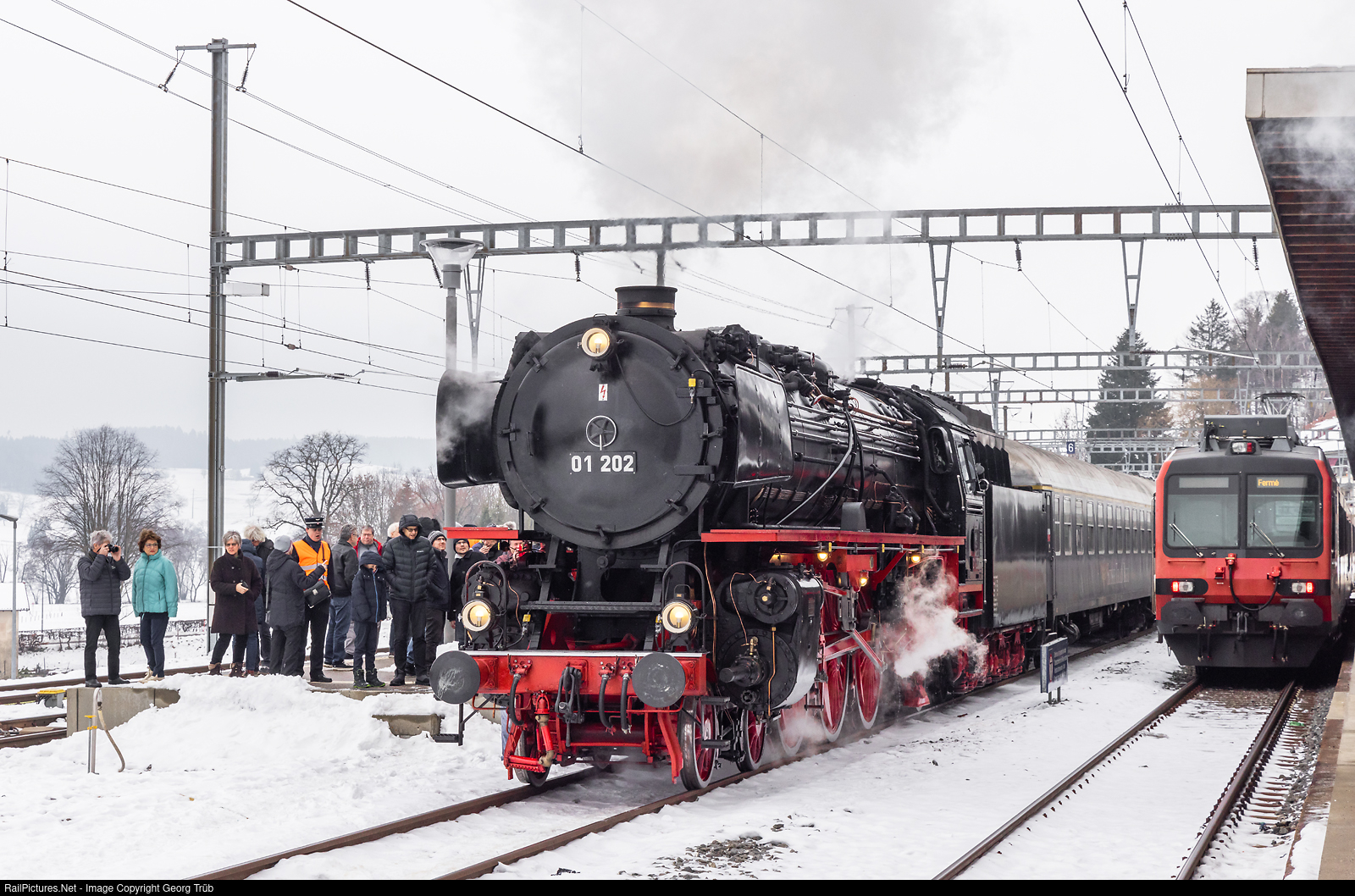 The winter steam special of ZRT Reisen from Lyss via Bern-Fribourg-Lausanne to Vallorbe stopped at Romont for a short fresh air break. The 4-6-2 former Deutsche Bundesbahn express train steamlocomotive 01 # 202 of the association "Pacific 01 202" from Lyss is pulling the 4 car train. The locomotive was built in 1936 by Henschel for the Deutsche Reichsbahn and is allowed to run 120 km/h in Switzerland (130 km/h in Germany).