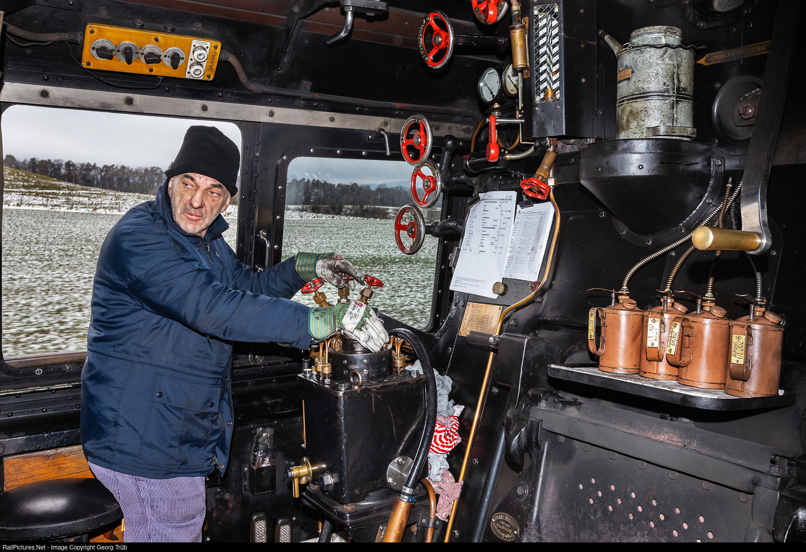 There are only short interruptions in throwing coal into the firebox of express train steamlocomotive 01 # 202 on the 2.1 % grade up to Vallorbe in the Jura mountain range. Rolf D. is fireman and responsible for the left side of the locomotive, together with colleague Rolf S. The winter steam special of ZRT Reisen with 4 cars and 177 ton load is between La Sarraz and Croy-Romainmotier near Arnex.