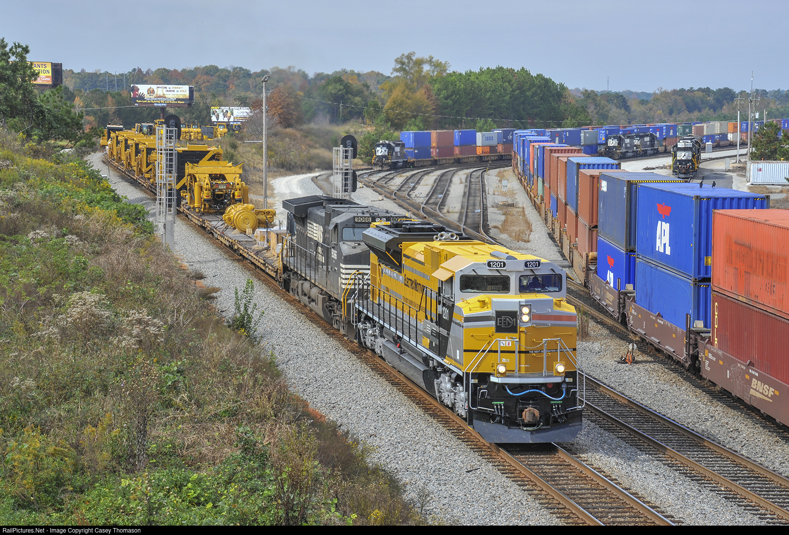 NS train 055 passes by Whitaker Yard in Austell, Georgia, with the (then) weekly train load of Caterpillar tractors bound for Savannah for export. Of course, the star of the show this day was the unique SD70ACe demonstrator painted in special Caterpillar colors. This was a one-time-show for 1201, special arrangements were made for it to lead the train all the way across NS from the CAT factory in Peoria, Illinois, to the port in Savannah. It trailed back north and was mostly hidden afterwards. It was soon sold and painted red as Arkansas and Missouri #70.
