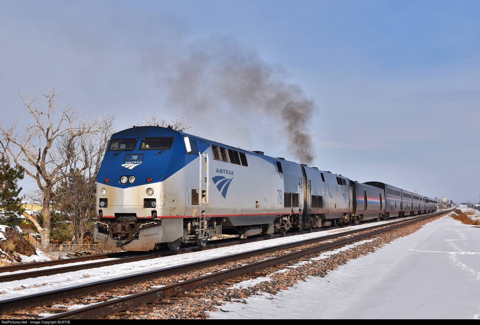 | Amtrak engine #78 (P42DC) leading the California Zephyr 5 train notches up as it leaves the siding at Irondale, Colorado and heads to Denver. It took the siding so that the California Zephyr 6 train could pass.