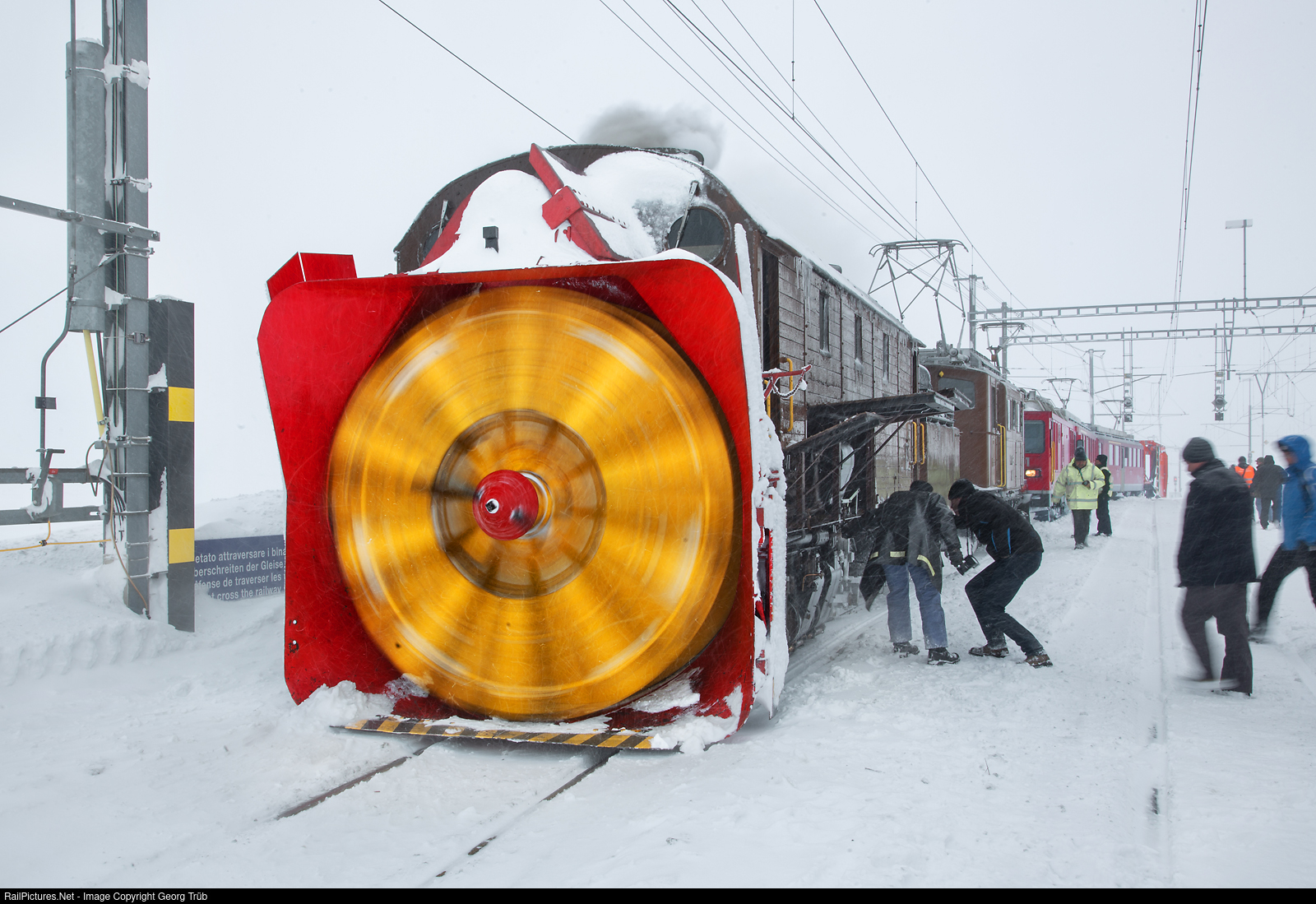 | The steam rotary snow blower Xrot d # 9213 is turning the blower wheel during the photo event on Ospizio Bernina. The self propelled 0-6-0+0-6-0 vehicle is supported by the "Bernina Crocodile" Ge 4/4 # 182. |