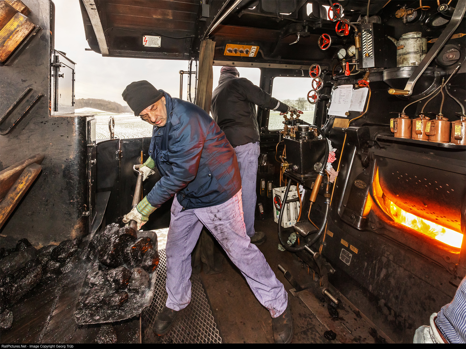 | Fireman Rolf D. throws full shovels of Polish coal into the hungry firebox of the 4-6-2 expresstrain steam locomotive 01 # 202 on the 2.1 % gradient from Daillens up to Vallorbe in the Jura mountain range. Meanwhile, his colleague Rolf S. looks at the signals and observes the track on the left side of the locomotive. The 01 # 202 of the association "Pacific 01 202" pulls 4 cars (Suisse Train Bleu) with a weight of 177 tons of the winter steam trip, organized by ZRT Reisen, from Lyss via Bern-Fribourg-Lausanne to Vallorbe. |