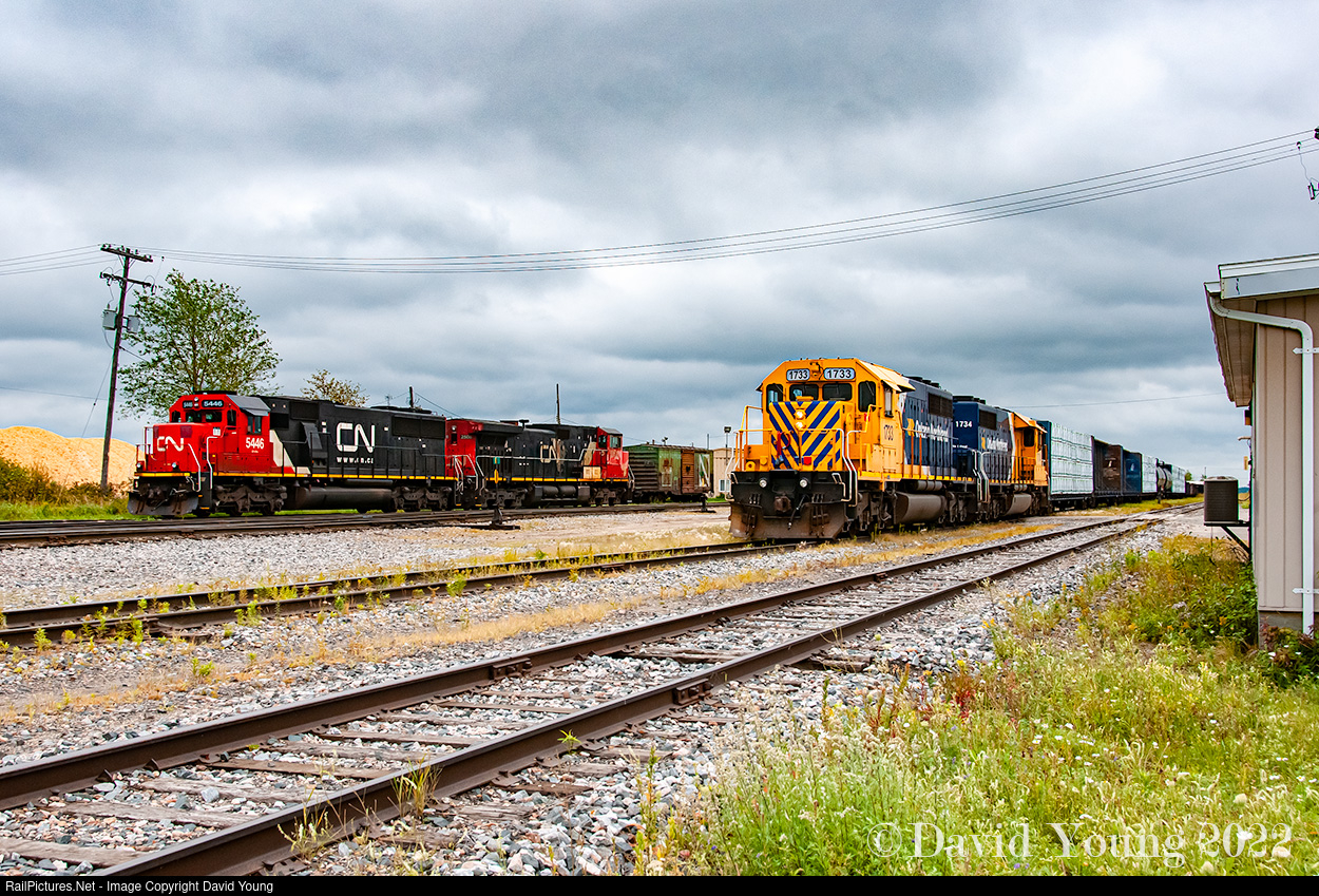 Passing the Ontario Northland bunkhouse, freight 313 arrives from Cochrane while off to the side CN 5446 and CN 2508 sit parked awaiting to come on duty later that afternoon. The power from the incoming freight will cut off here and nose onto their waiting train just behind the camera, departing just as quickly as they arrived. One track over sits the ONR yard engine, which will couple onto this inbound traffic and sort out the locals before setting up any outbound traffic for the CN to take south to their main at Oba. With the sale of the former Algoma Central south of Oba and subsequent closure of Hawk Junction, a job has been established in Hearst and as of summer of 2022 runs Monday thru Friday.